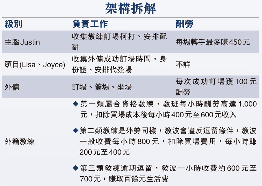 Sophia透露,老闆Justin認識不少網球教練,每周收到訂場要求後,便將清單交予頭目發號施令。除了搶場,成員另一工作是到現場簽到,但Sophia說:「即使因為工作無法現身(簽場),只要事前將身份證交給頭目,再由她委派其他同鄉代為『簽場』便可。」