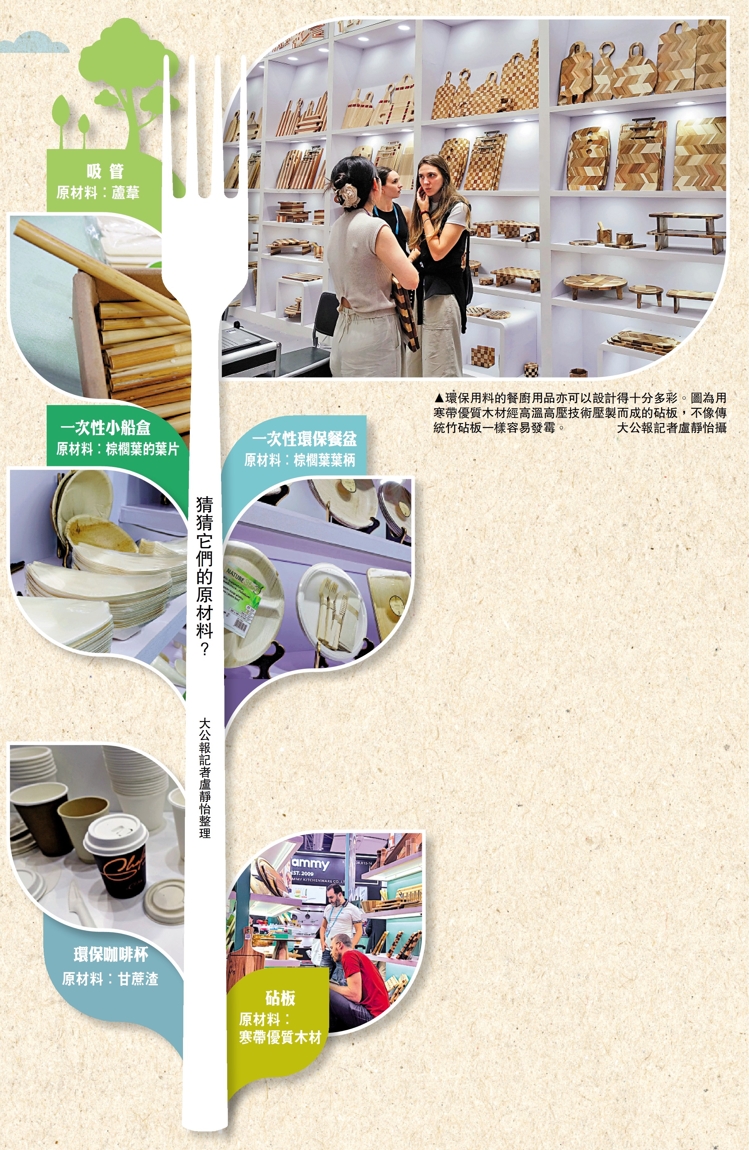 (大公報記者 盧靜怡廣州報道)蘆葦吸管、棕櫚葉做的餐盤、甘蔗渣製成的刀叉……第135屆廣交會於5日圓滿閉幕,採訪期間,大公報記者在傢具用品的餐具展區內,看到了種類琳琅滿目、原料五花八門的一次性環保餐具。不少企業採用當地土生土長的農作物為原料,比如棕櫚葉、蘆葦、竹子、木頭等天然材料,通過高溫壓型成環保餐具,竹纖維製作的刀叉甚至可以切動戰斧牛排。受香港「限塑令」影響,香港業界採購環保餐具意欲增加。不少參展出口企業表示,本屆廣交會上明顯多了不少前來問詢的香港採購商,有企業已經接待多批到工廠實地參觀採購的香港客戶。