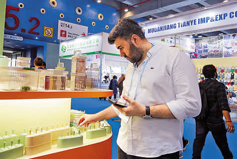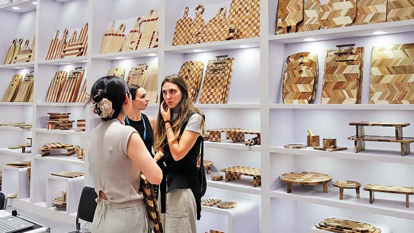 記者發現,第135屆廣交會上,很多展品不僅注重「設計感」和「顏值」,還融合着環保元素。在浙江味老大工貿有限公司展位,各種印着複雜花紋的木砧板成為引人注目的「顯眼包」,不少採購商都忍不住拿起來端詳一番。「我們彩色木鏟的原料採自彩虹木,對原材料樹皮進行染色處理後,經過層層復壓、切割等工藝製成的。」該公司總經理張帥表示,現場展出的木纖維砧板選用寒帶優質木材,經高溫高壓技術壓製而成,解決了傳統竹木砧板易發霉、易開裂等問題,健康又環保。據了解,「味老大」是竹製廚具用品生產製造企業,已參加了十屆廣交會。公司自主研發的「無公害竹製板材產業化開發」被列入「國家級星火計劃項目」。