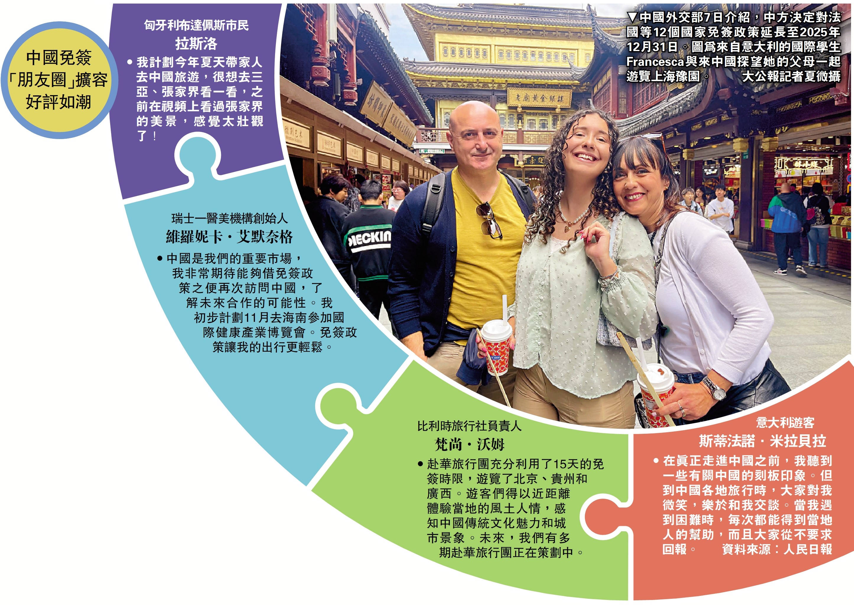 (大公報 記者 夏微、李陽波)新華社7日報道,中國領導人訪法期間宣布,將對法國等12國公民短期來華的免簽政策延長至2025年年底。外交部發言人林劍7日在例行記者會上應詢進一步介紹相關情況時表示,中方決定對法國、德國等12個國家免簽政策延長至2025年12月31日。國家移民管理局最新數據顯示,中國免簽「朋友圈」擴容顯現積極效應,今年一季度,免簽入境外國人198.8萬人次、同比上升266.1%。入境遊客除了遊覽熱門景區景點,足跡開始深入城市社區,沉浸式體驗旅遊目的地的風土人情。