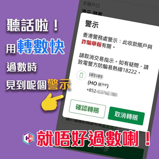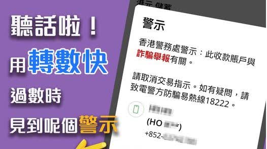 警方表示,若經「轉數快」轉賬的賬戶出現高危警示,代表與詐騙舉報有關,意味「高危有伏」,但有個別受害人或會不以為意、半信半疑,向要求轉款的網店商家、網上客戶服務員、網友等查詢,讓騙徒有機會以各種「理由」解釋出現警示的原因,例如賬戶被警方錯誤標籤、銀行記錄出錯、系統測試當中、賬戶正進行審批程序等,試圖將原因「合理化」。