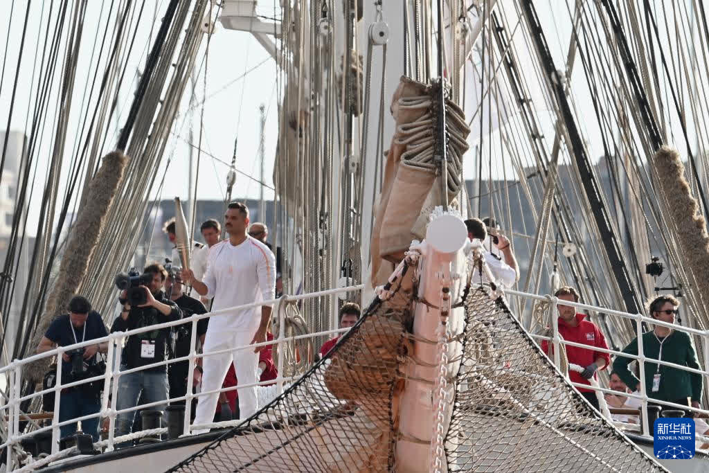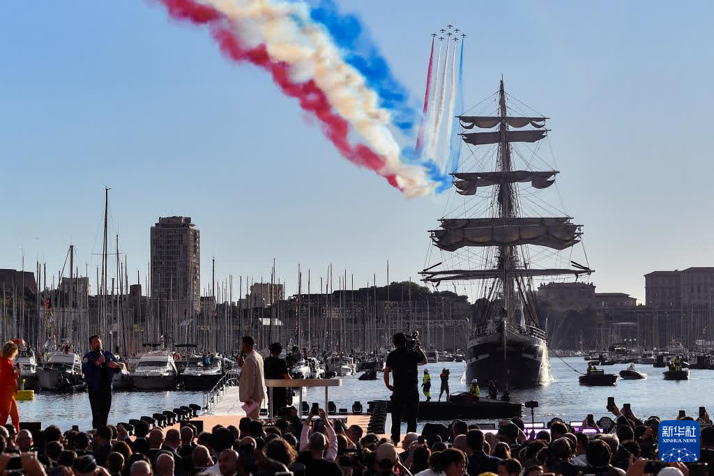 傍晚時分,伴隨着現場觀眾高唱法國國歌《馬賽曲》,「貝勒姆」號緩緩駛進港口,著名的「法蘭西巡邏兵」飛行表演隊從港口上空呼嘯而過,先後展示了奧運五環與法國國旗的圖案。
