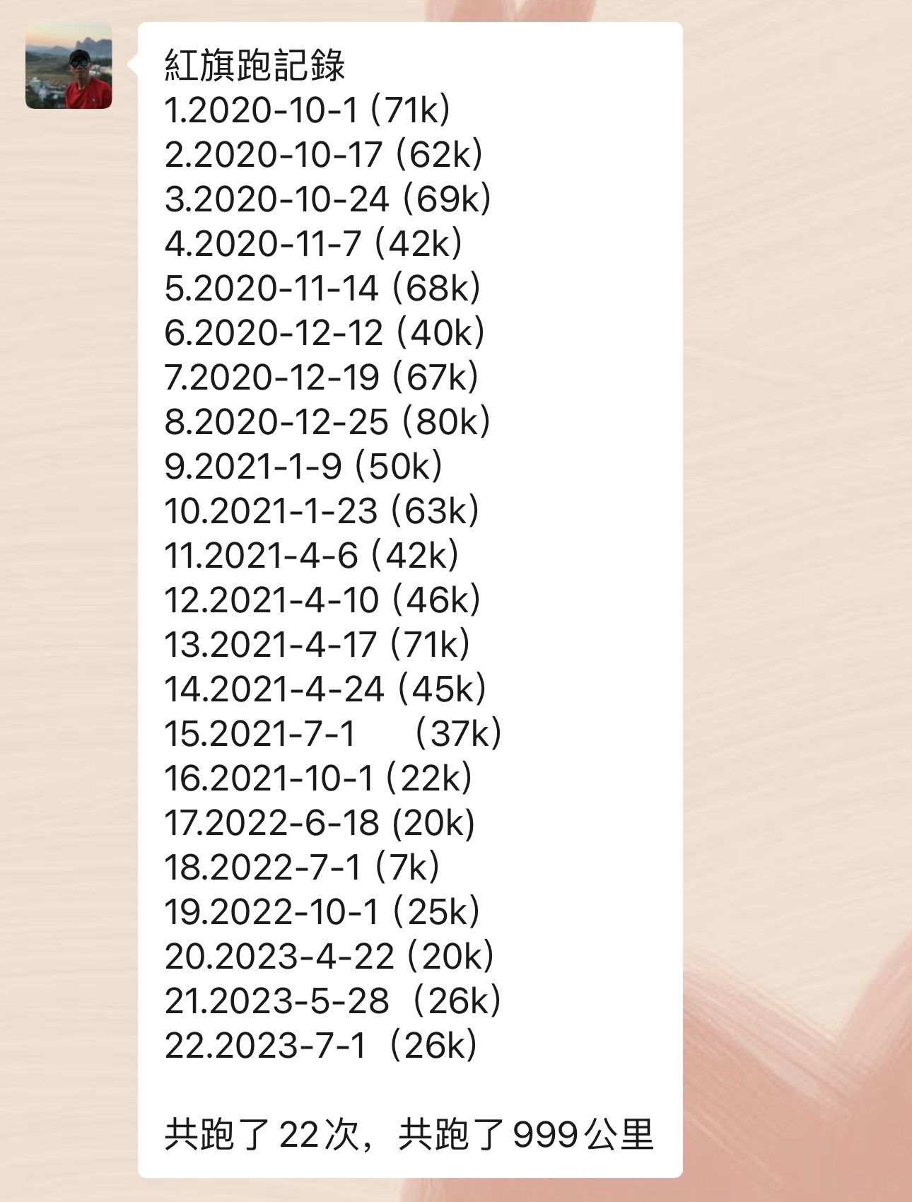 每逢「七一」「十一」,梁志森都會帶上國旗跑步,有一天就跑了70多公里,「祖國多少歲我便跑多少公里」。從天水圍到將軍澳,梁志森用跑步慶祝國慶。一路上吸引了不少內地同胞的眼光,人們會借他的紅旗拍照,為他加油,這是對他最大的鼓勵。「我也會帶一些小旗子,沿途遇到有緣人,便會送給他們。」這些年他通過跑步結識了很多志同道合的人士,在鯉魚門開設「銀龍咖啡館」的愛國店主K姐也是他在跑途中常常攀談的朋友。