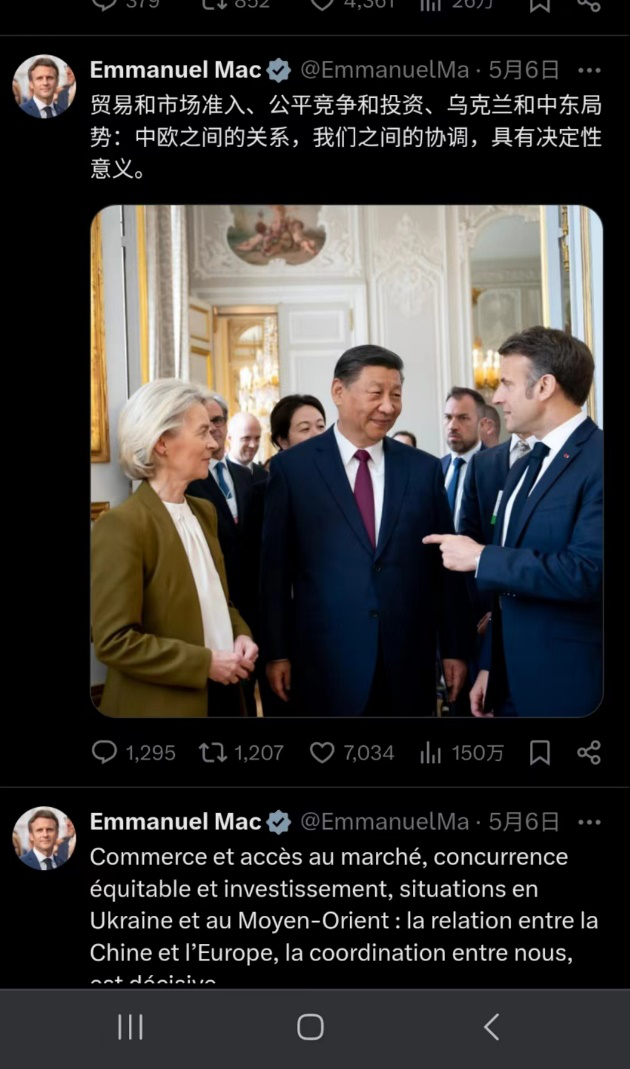 習主席國事訪問的成果遠遠超出外界的預料,特別是中法兩國的聯合聲明和元首的聯合記者會,讓外界非常矚目。近幾年,聯合聲明和聯合記者會,是拜登最喜歡做的事,誰也沒有想到中國和法國之間、兩國元首之間也可以做成功。尤其是馬克龍,在得到世界第二大經濟體中國的巨大支持後,「歐盟盟主」的位置穩了。
