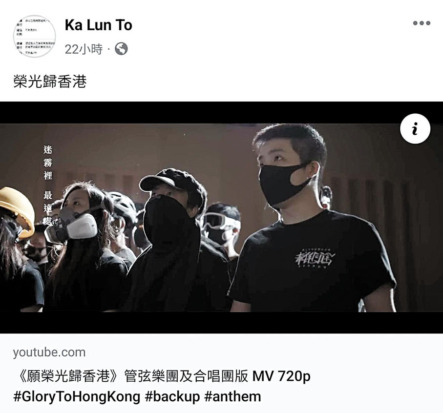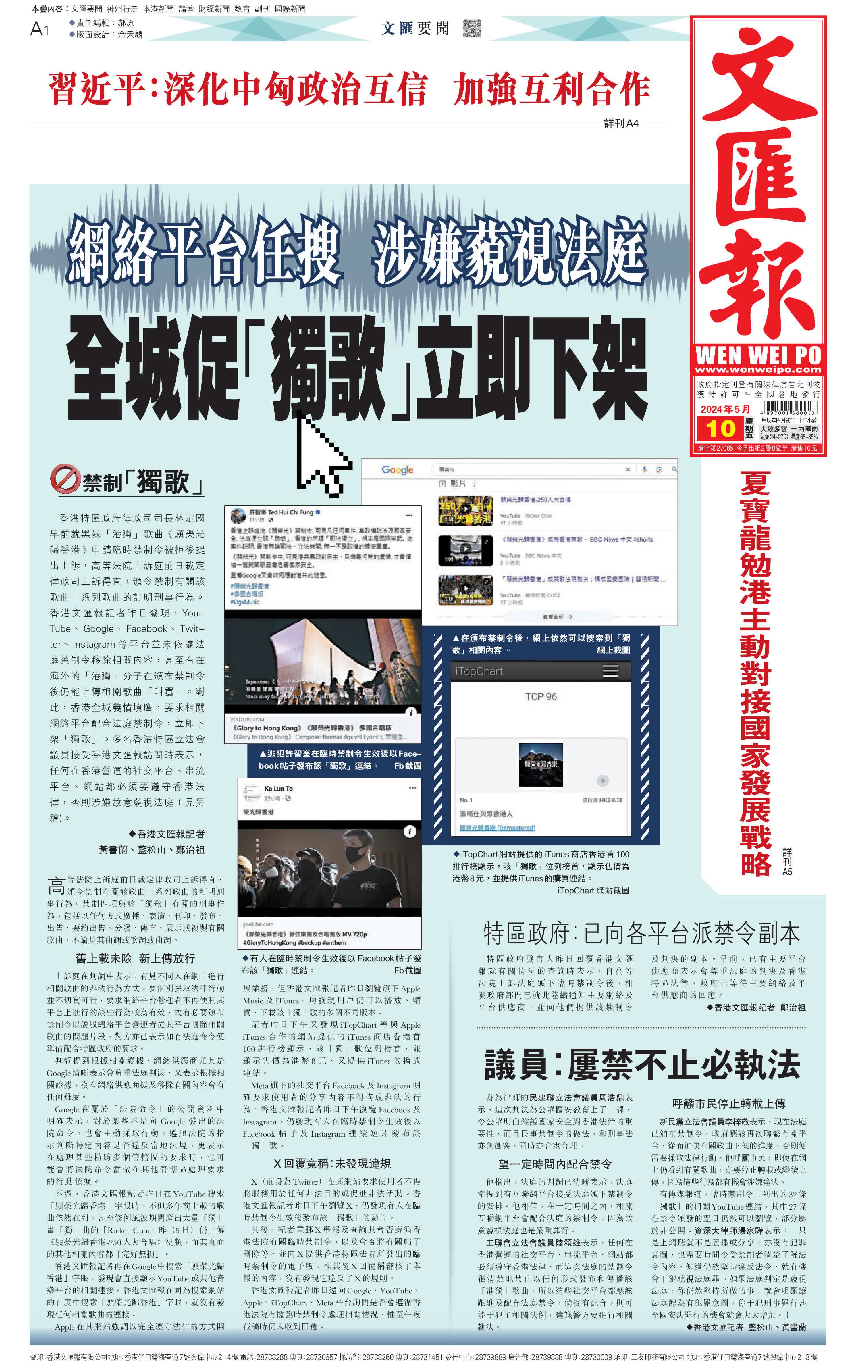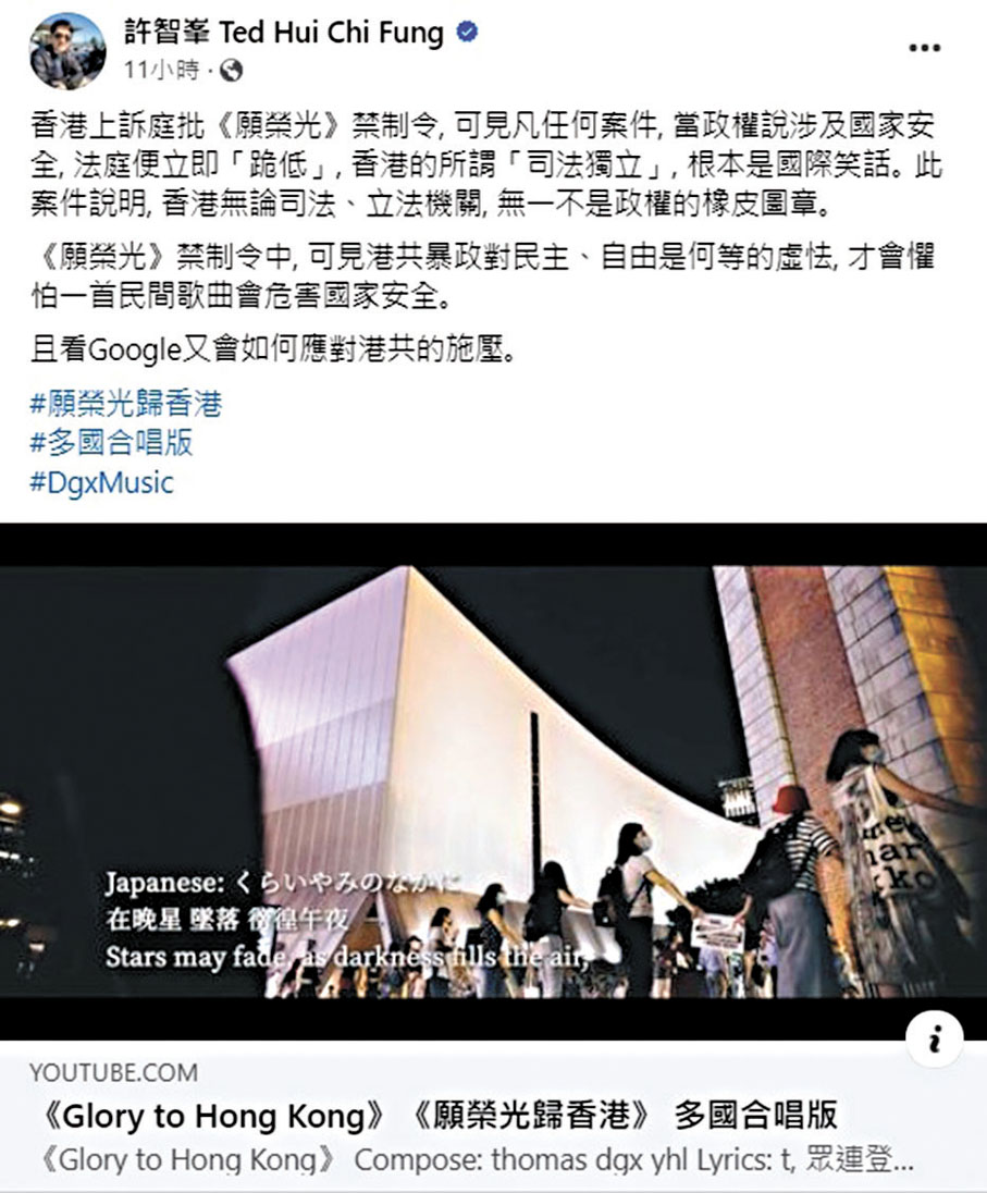 (香港文匯報記者黃書蘭、藍松山、鄭治祖)香港特區政府律政司司長林定國早前就黑暴「港獨」歌曲《願榮光歸香港》申請臨時禁制令被拒後提出上訴,高等法院上訴庭前日裁定律政司上訴得直,頒令禁制有關該歌曲一系列歌曲的訂明刑事行為。香港文匯報記者昨日發現,YouTube、Google、Facebook、Twitter、Instagram等平台並未依據法庭禁制令移除相關內容,甚至有在海外的「港獨」分子在頒布禁制令後仍能上傳相關歌曲「叫囂」。對此,香港全城義憤填膺,要求相關網絡平台配合法庭禁制令,立即下架「獨歌」。多名香港特區立法會議員接受香港文匯報訪問時表示,任何在香港營運的社交平台、串流平台、網站都必須要遵守香港法律,否則涉嫌故意藐視法庭。