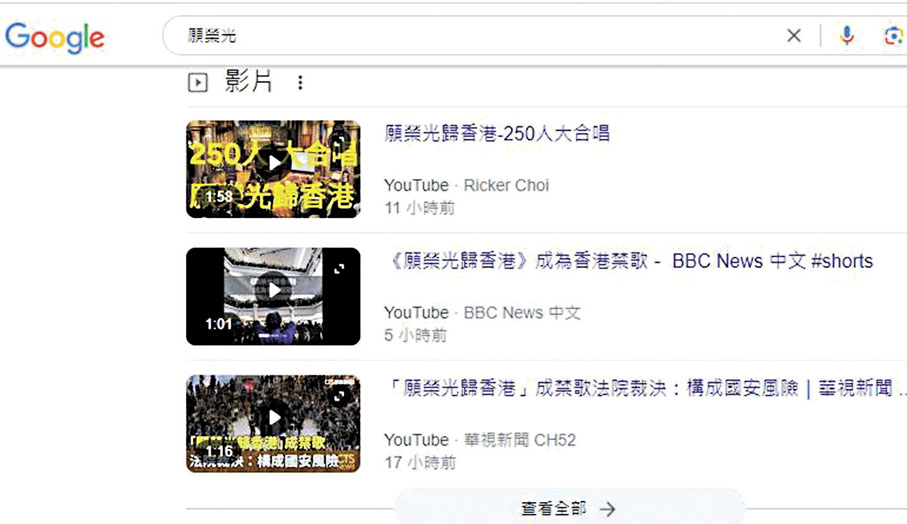 不過,香港文匯報記者昨日在YouTube搜索「願榮光歸香港」字眼時,不但多年前上載的歌曲依然在列,甚至修例風波期間產出大量「獨」畫「獨」曲的「Ricker Choi」昨(9日)仍上傳《願榮光歸香港-250人大合唱》視頻,而其頁面的其他相關內容都「完好無損」。