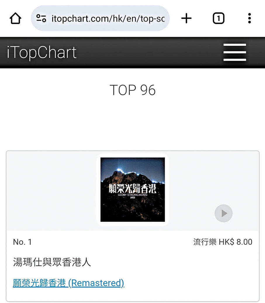 記者昨日下午又發現iTopChart等與Apple iTunes合作的網站提供的iTunes商店香港首100排行榜顯示,該「獨」歌位列榜首,並顯示售價為港幣8元,又提供iTunes的播放連結。