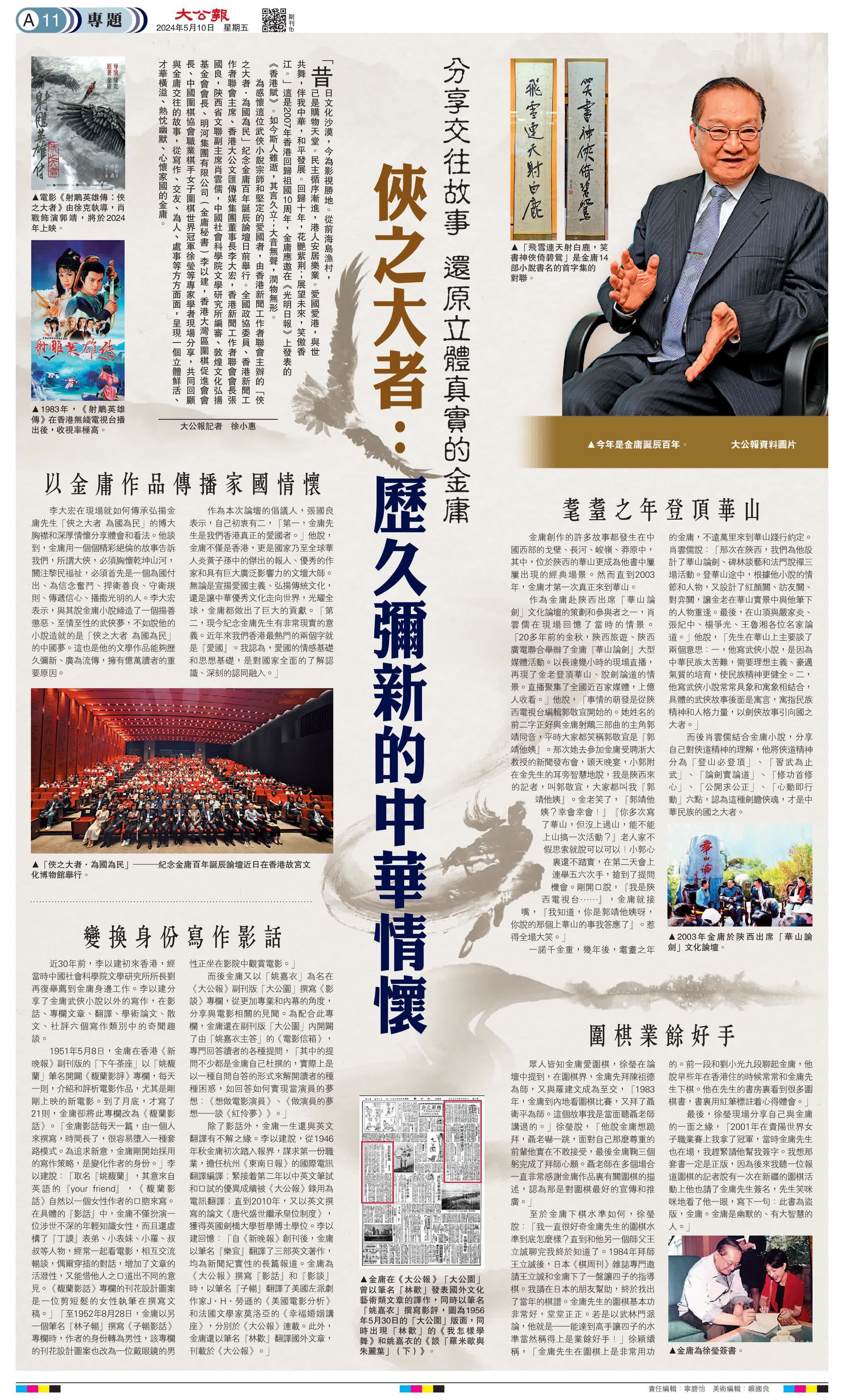 為感懷這位武俠小說宗師和堅定的愛國者,由香港新聞工作者聯會主辦的「俠之大者·為國為民」紀念金庸百年誕辰論壇日前舉行。全國政協委員、香港新聞工作者聯會主席、香港大公文匯傳媒集團董事長李大宏,香港新聞工作者聯會會長張國良,陝西省文聯副主席肖雲儒,中國社會科學院文學研究所編審、敦煌文化弘揚基金會會長、明河集團有限公司(金庸秘書)李以建,香港大灣區圍棋促進會會長、中國圍棋協會職業棋手女子圍棋世界冠軍徐瑩等專家學者現場分享,共同回顧與金庸交往的故事,從寫作、交友、為人、處事等方方面面,呈現一個立體鮮活、才華橫溢、熱忱幽默、心懷家國的金庸。