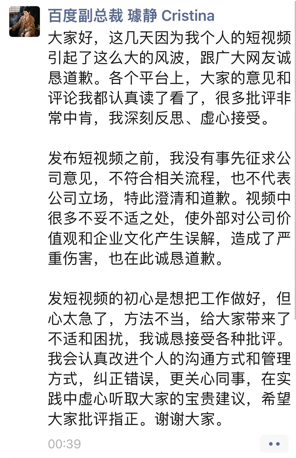 9日凌晨,針對近期在短視頻平台引發的爭議,璩靜在朋友圈發文道歉。璩靜表示:「大家好,這幾天因為我個人的短視頻引起了這麼大的風波,跟廣大網友誠懇道歉。各個平台上,大家的意見和評論我都認真讀了看了,很多批評非常中肯,我深刻反思、虛心接受。發布短視頻之前,我沒有事先徵求公司意見,不符合相關流程,也不代表公司立場,特此澄清和道歉。視頻中很多不妥不適之處,使外部對公司價值觀和企業文化產生誤解,造成了嚴重傷害,也在此誠懇道歉。發短視頻的初心是想把工作做好,但心太急了,方法不當,給大家帶來了不適和困擾,我誠懇接受各種批評。我會認真改進個人的溝通方式和管理方式,糾正錯誤,更關心同事,在實踐中虛心聽取大家的寶貴建議,希望大家批評指正。謝謝大家。」