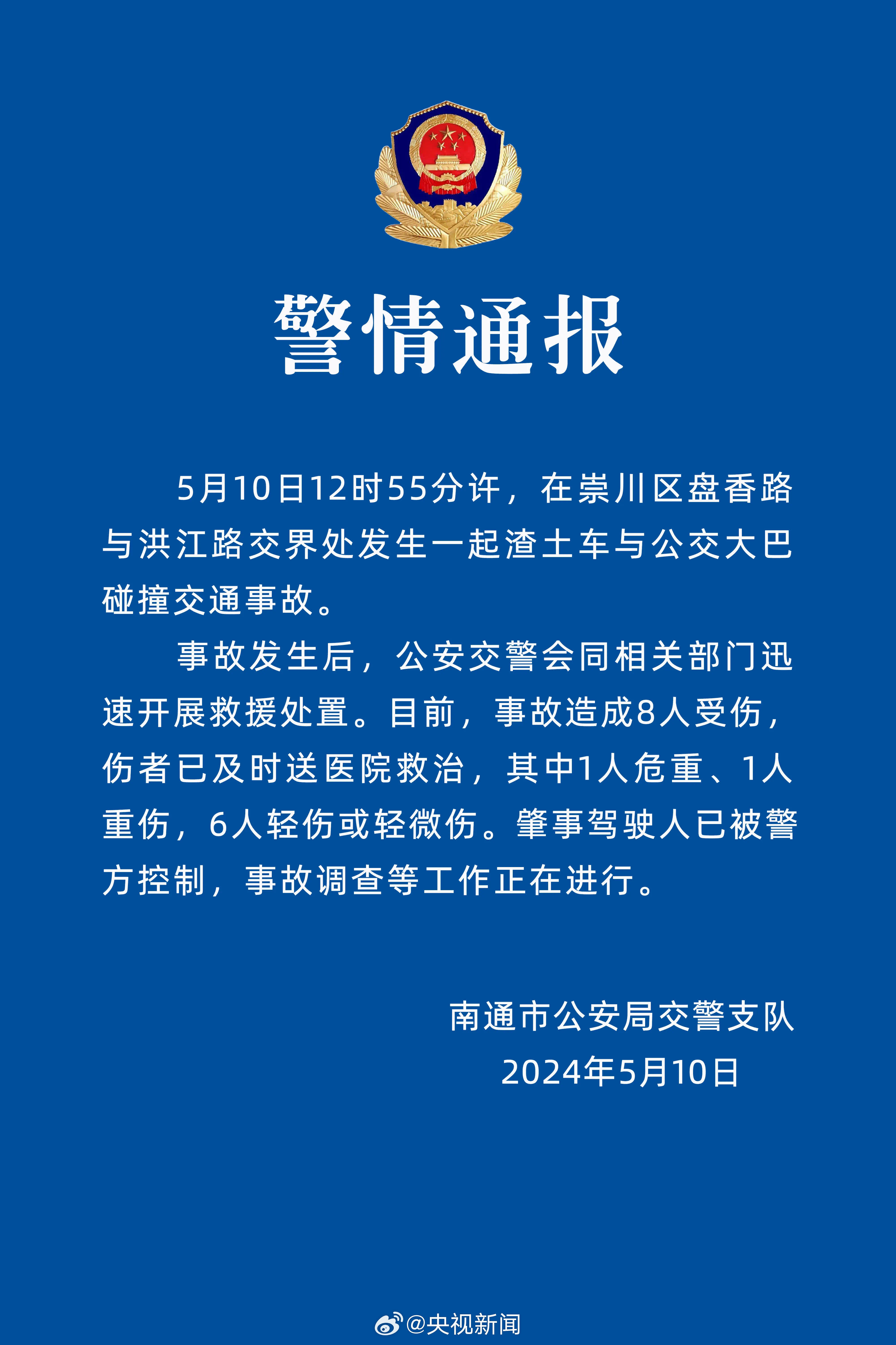 根據南通市公安局交警支隊發布的警情通報,事故造成8人受傷,傷者已及時送醫院救治,其中1人危重、1人重傷,6人輕傷或輕微傷。肇事駕駛人已被警方控制,事故調查等工作正在進行。