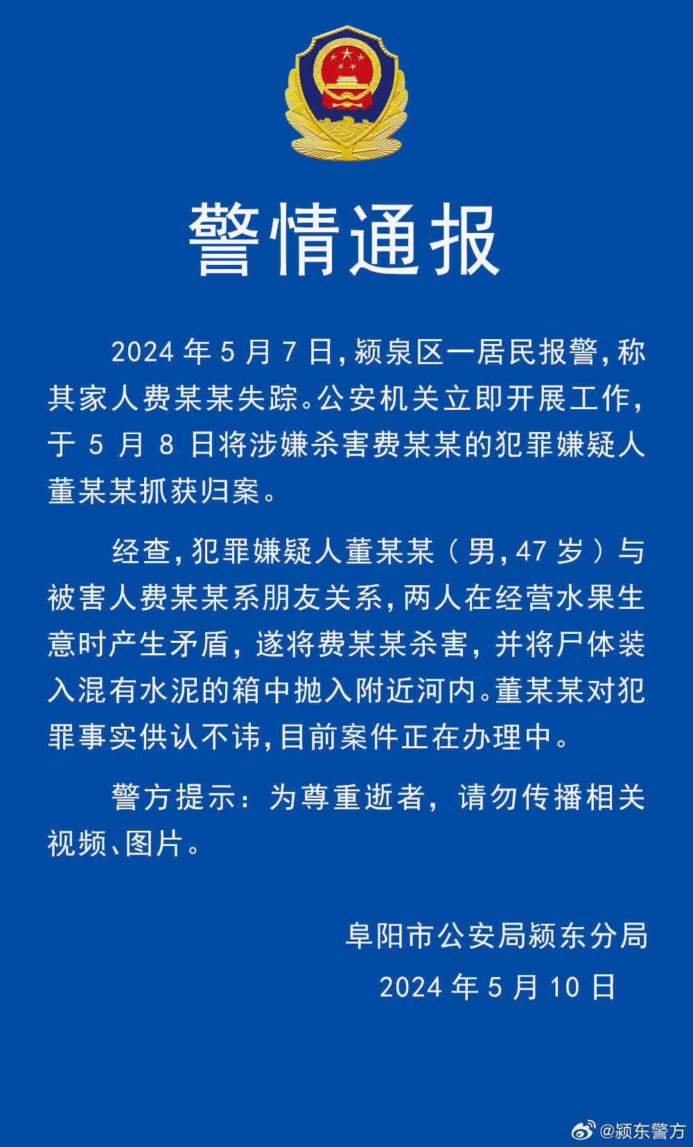 經查,犯罪嫌疑人董某某(男,47歲)與被害人費某某是朋友關係,兩人在經營水果生意時產生矛盾,董某某遂將費某某殺害,並將屍體裝入混有水泥的箱中拋入附近河內。董某某對犯罪事實供認不諱,目前案件正在辦理中。