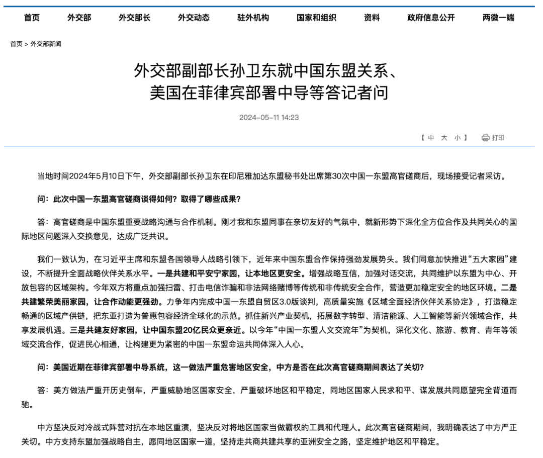 據外交部網站消息,當地時間2024年5月10日下午,外交部副部長孫衛東在印尼雅加達東盟秘書處出席第30次中國—東盟高官磋商後,現場接受記者採訪。