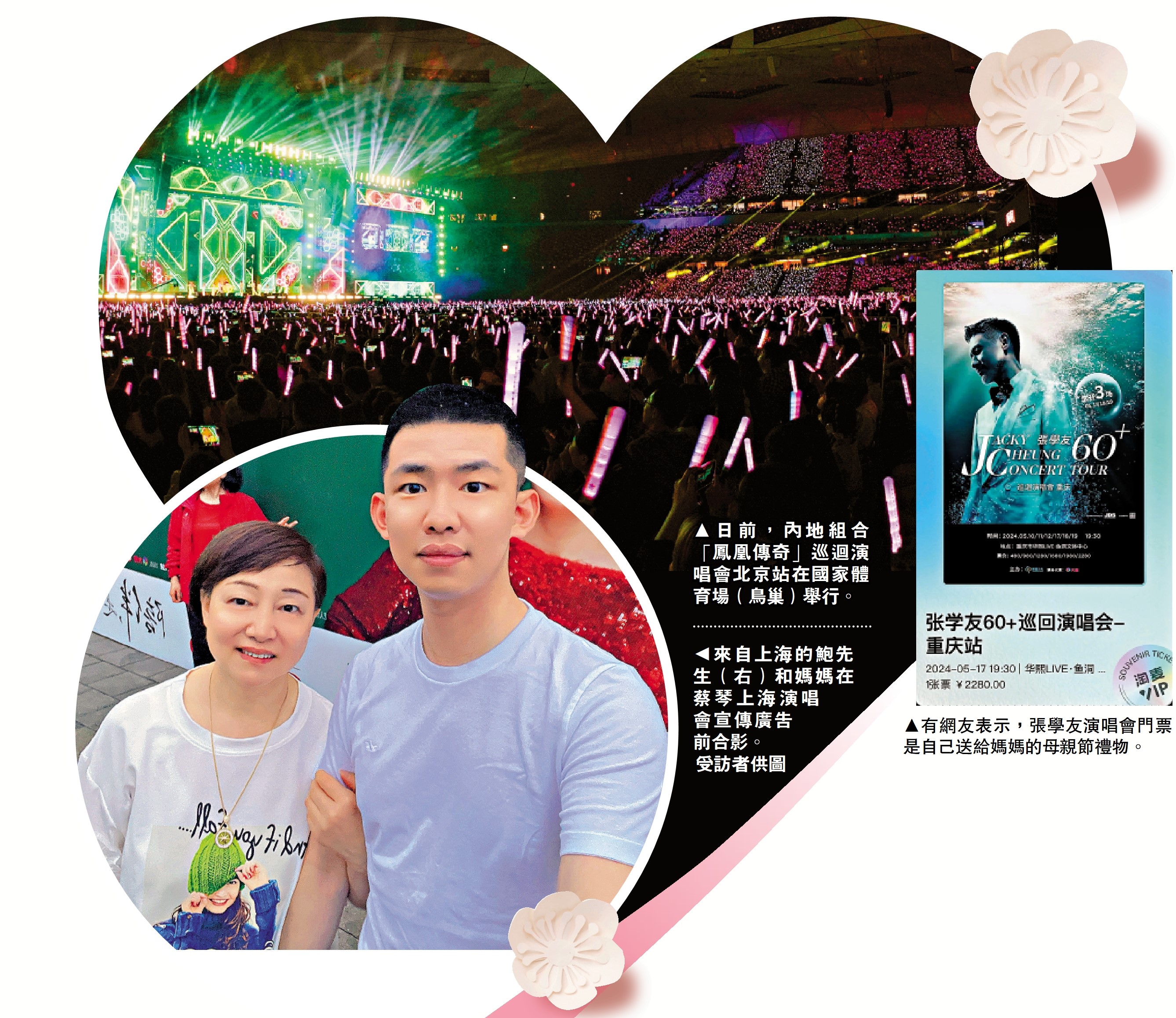 (大公報記者 江鑫嫻)這個母親節,你為家裏最最可愛的媽媽準備了什麼驚喜呢?隨着內地演唱會市場的持續升溫,除了送花、請吃飯、看電影等傳統項目外,今年不少年輕人選擇送時尚、送陪伴,陪媽媽一起去看當年她心目中偶像們的演唱會:蔡琴、張學友、伍佰……多位受訪者告訴大公報記者,自己會在能力範圍之內給媽媽買最好的票,還會提前做好跟唱攻略,以最佳狀態陪媽媽一起觀看演出。「陪媽媽赴一場當年的約,去看看媽媽年輕時的偶像,看見媽媽幸福我就幸福!」對於「陪媽入場」的年輕人而言,這也許不僅僅是一場演唱會,更是陪媽媽重走青春路的回程票。