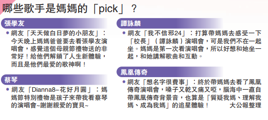 「請媽媽去看她偶像的演唱會!母親節再加上媽媽的生日月,最適合媽媽看的演出一定是張學友的演唱會。」網友「北美洲膽小的蝦條」在社交平台上曬出了她的母親節禮物──一張提前兩個月就買好了的「張學友60+巡迴演唱會」重慶站2280元門票。她說,「媽媽覺得我買的內場門票太貴了,但我覺得等我到了三四十歲,回看這一天,肯定會非常自豪能在22歲時,盡力讓媽媽看了內場演唱會。而且這2280元涵蓋的不僅僅是3個小時的演唱會,還有從買到票開始兩個月的好心情。看見媽媽幸福我也會幸福。」