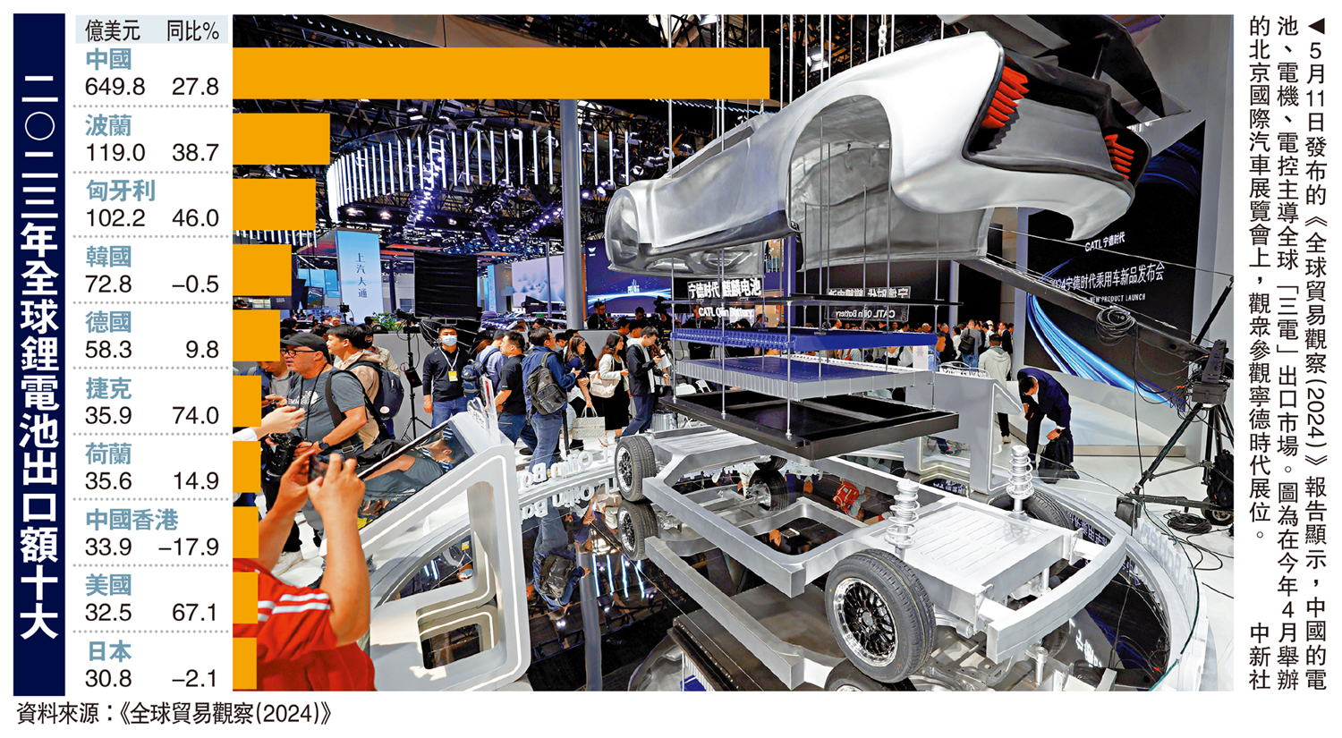 (大公報記者 宋偉大連報道)首屆全球貿易觀察論壇11日在遼寧大連舉行,現場發布的《全球貿易觀察(2024)》報告顯示,2023年世界經濟復甦乏力,全球貨物貿易規模23.5萬億美元,較上年同期下降6.2%,未能延續增長態勢。但與此同時,中國以14.2%的出口國際市場份額佔比,連續7年保持貨物貿易第一大國地位,顯示出較強的發展韌性。特別是在新能源汽車領域,中國在全球電動汽車產業鏈各環節均佔據核心地位,主導「三電」出口市場,彰顯「中國智造」力量。不過,受訪專家對大公報表示,車載芯片仍是一大短板,應盡早突破,早日實現自主可控。