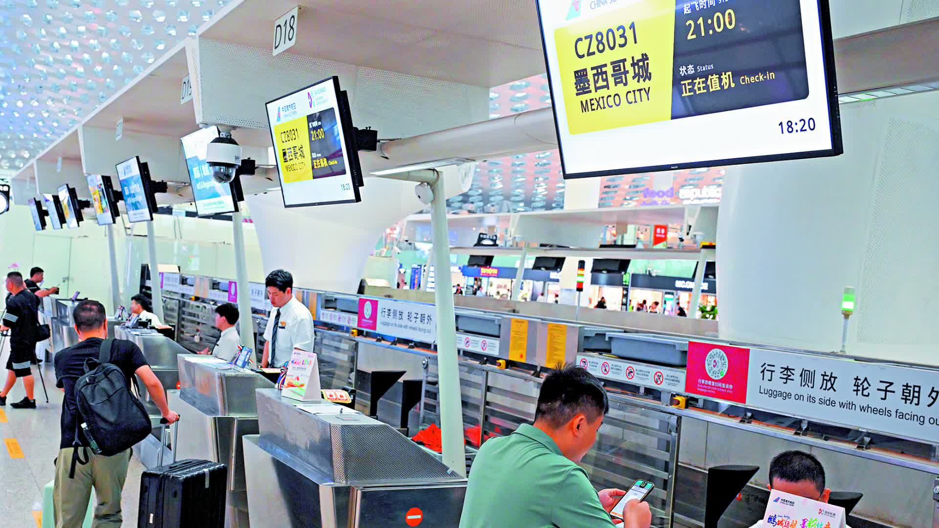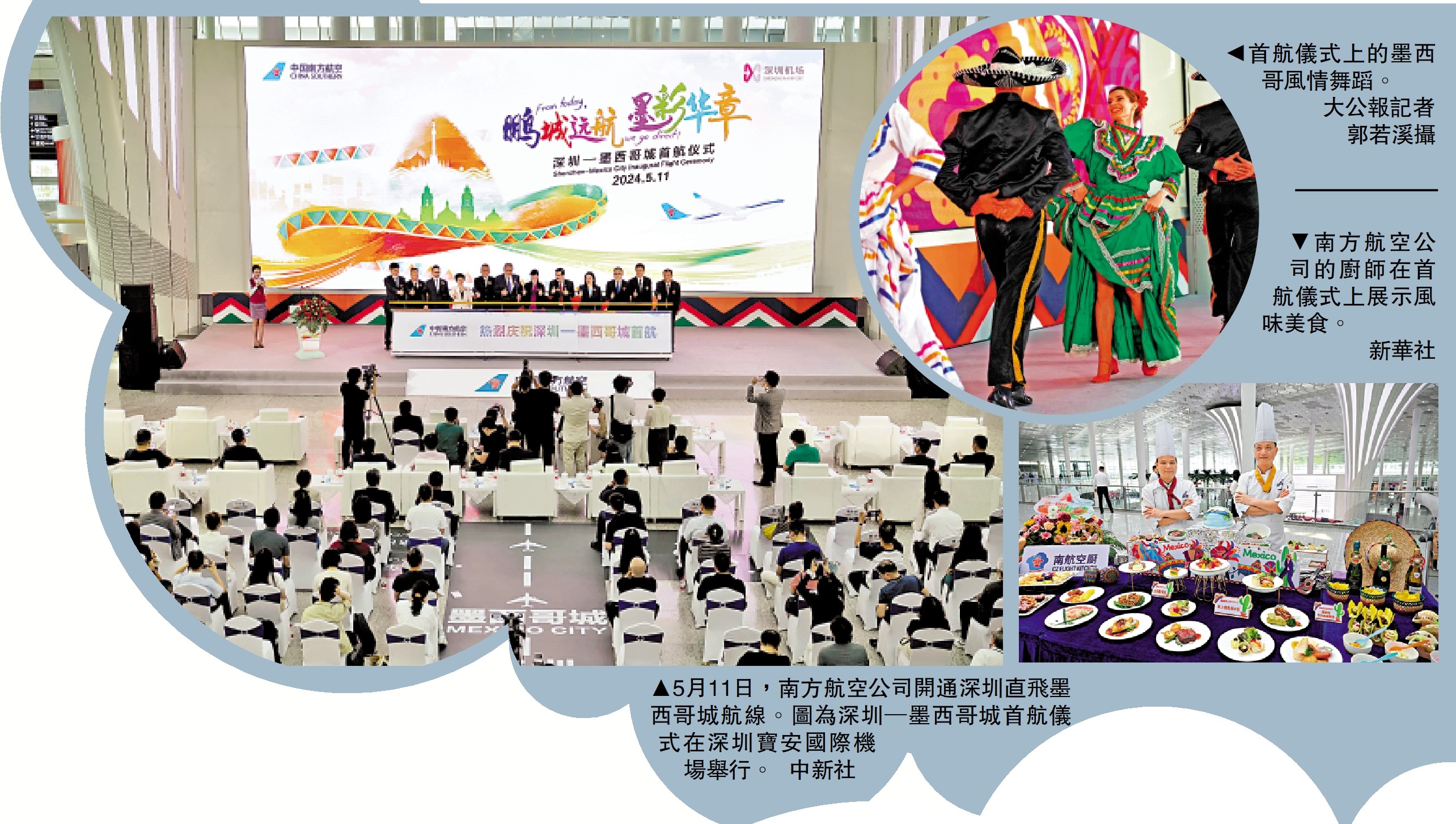 (大公報記者 郭若溪深圳報道)5月11日晚上21:00,中國南方航空深圳至墨西哥城航線的首航航班CZ8031從深圳寶安國際機場起飛,標誌着中國首條直飛拉丁美洲的客運航線正式開通。該航線全長14147公里,將超越廣州到美國紐約航線的12878公里,成為我國航程最長的國際客運航線,飛行時間約16小時。至此,深圳機場國際及地區客運航點突破40個,航線網絡持續完善。香港旅客到深圳機場「經深飛」,跨境巴士日均170班,可達香港機場及市區30餘個站點。