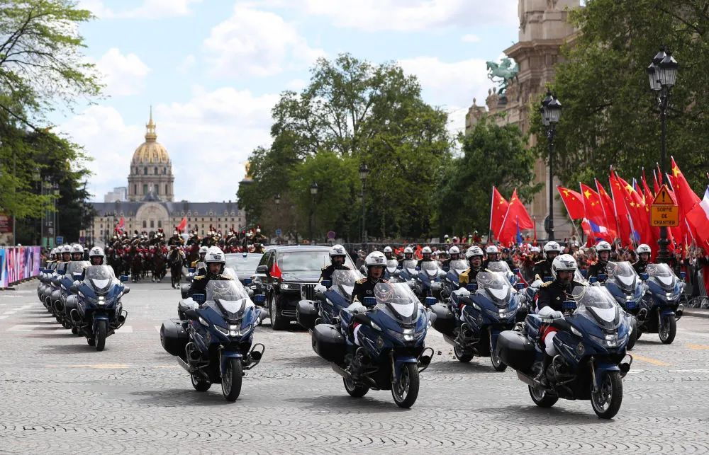 歡迎儀式後,習近平主席和夫人彭麗媛乘車赴愛麗舍宮,148名騎兵組成的禮兵馬隊和摩托車隊一路護送。馬蹄噔噔,踏響青灰色的石路。穿過塞納河上最美的亞歷山大三世橋,途經百餘年歷史的大皇宮、小皇宮,掠過戴高樂將軍雕像,彷彿行進在時間的長廊中。