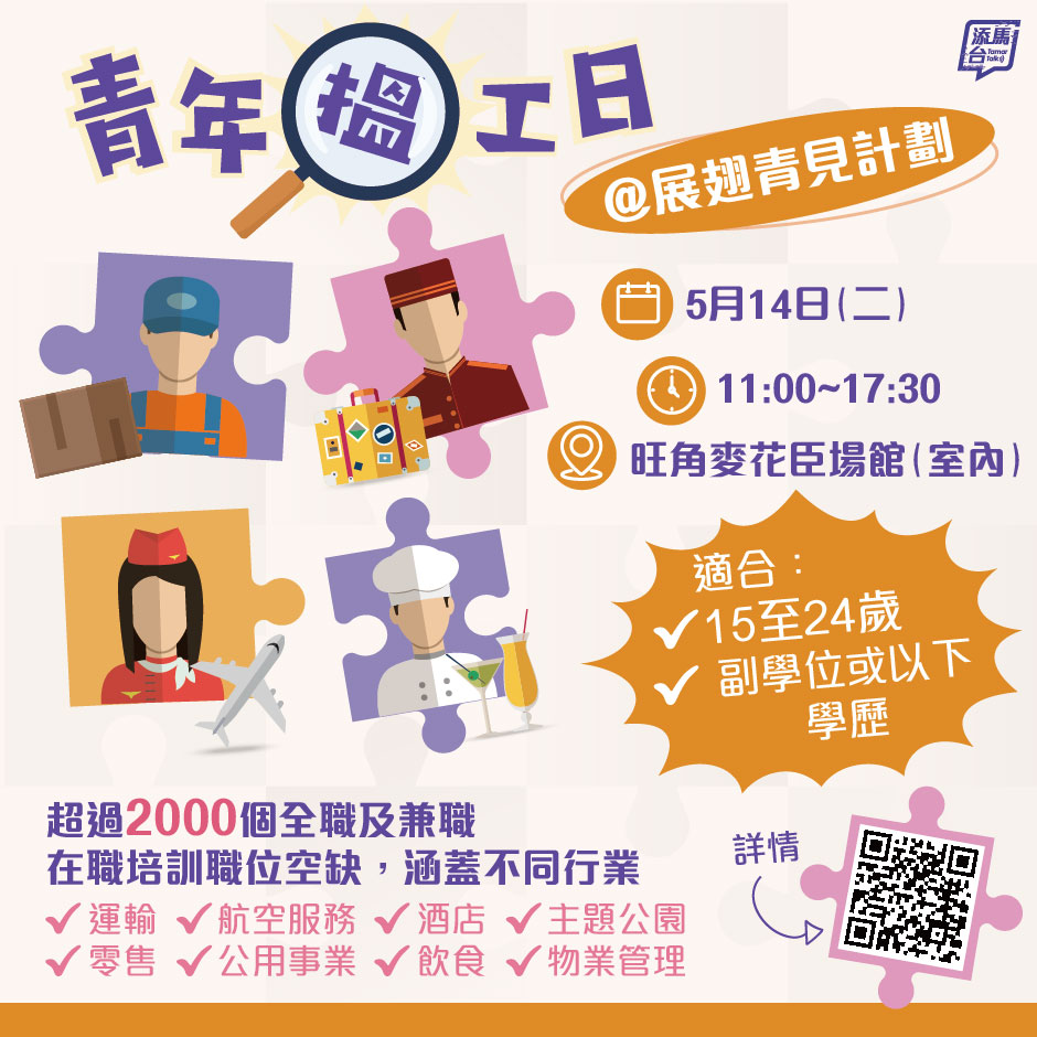 大公文匯全媒體報道,勞工處將於明日(14日)為15至24歲副學位或以下的青年舉辦「青年搵工日@展翅青見計劃」。