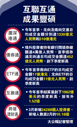 (大公報記者 許 臨)互聯互通踏入第十年,其間不斷完善與擴容,成果豐碩。而昨日兩地監管機構再宣布一系列措施優化「互換通」機制安排,與國際市場接軌。特區政府表示,中央對港金融市場的重視,以及兩地金融市場聯動發展的積極推動,為特區政府推進有關工作提供堅實的政策保障和廣闊空間。