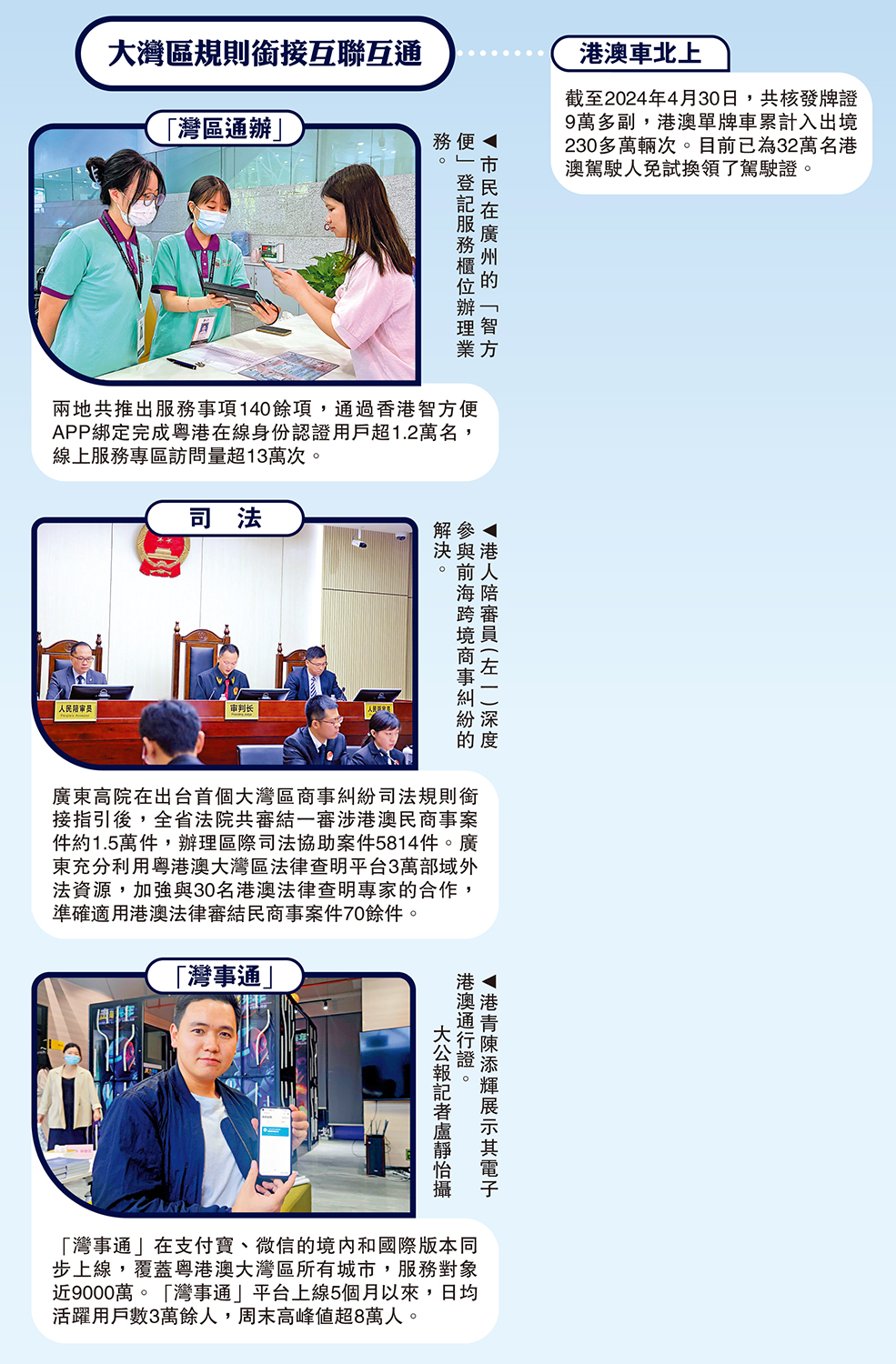 (大公報記者 盧靜怡)廣東省大灣區辦13日在發布會上公布了《廣東省推進粵港澳大灣區規則銜接機制對接典型案例(第二批)》,包含16項創新案例,涵蓋要素跨境流動、民生融合、營商環境、重大平台建設等領域。港澳車北上、「灣區認證」、南沙創新與港澳教育銜接機制、河套試點數據跨境交易等均入選,充分體現了大灣區城市間民生領域不斷融合的可喜趨勢,大灣區規則銜接「工具箱」越來越豐富。數據顯示,「港車北上」「澳車北上」政策實施順利,得到港澳居民熱烈反響。截至2024年4月30日,共核發牌證9萬多副,港澳單牌車累計入出境230多萬輛次。