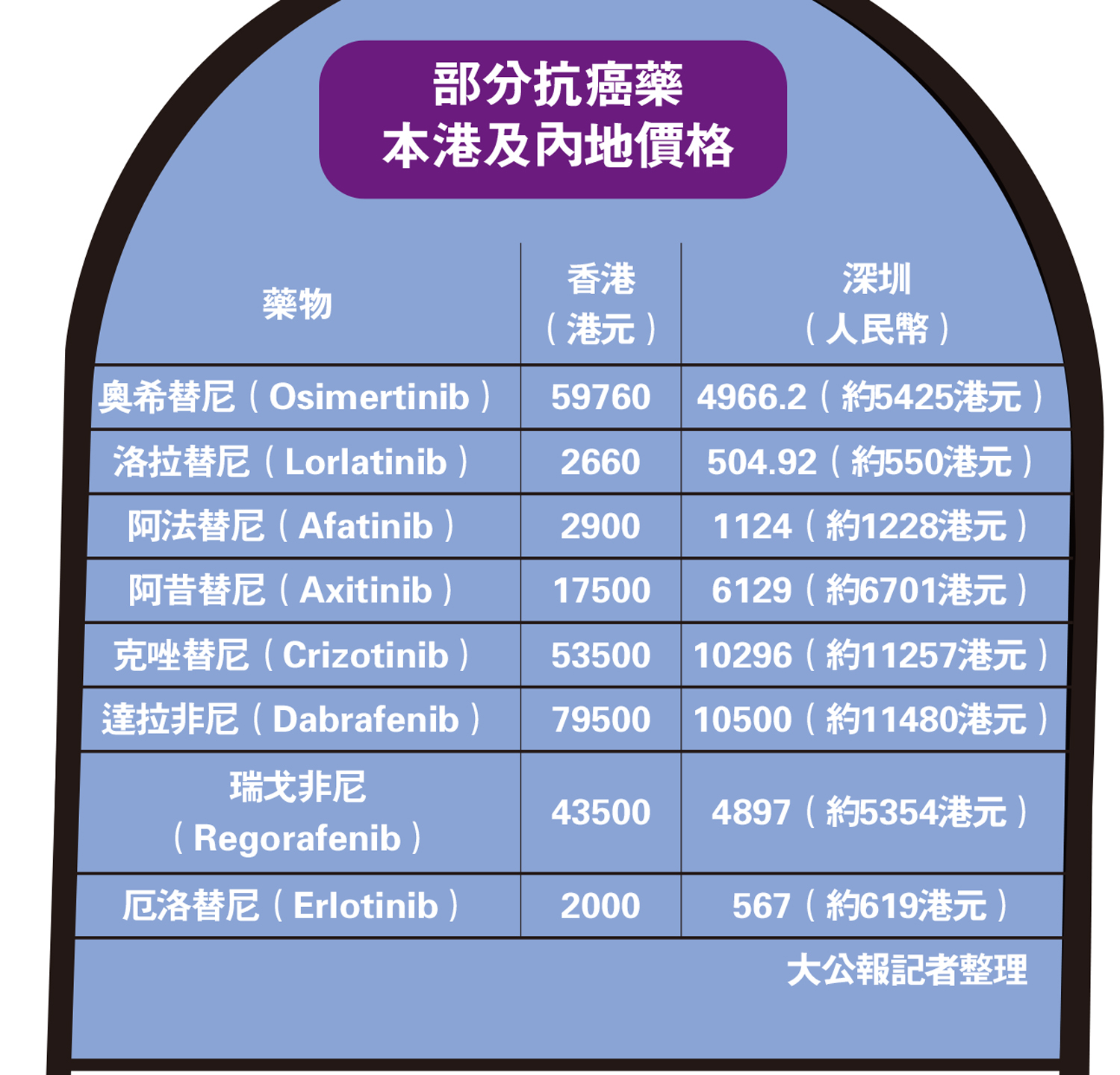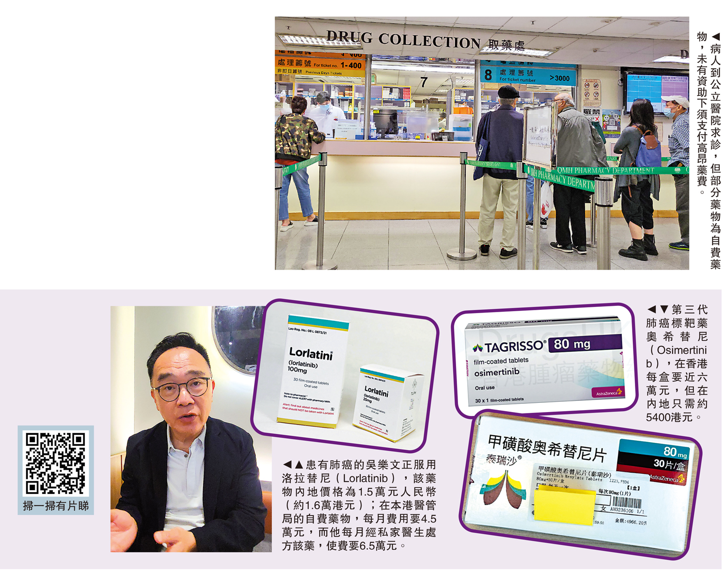 另一款由英國阿斯利康研發的第三代肺癌標靶藥奧希替尼(Osimertinib),2016年在港註冊,雖已列入醫管局的藥物名冊,卻屬自費藥物,大部分病人每月開銷近6萬元。但該藥2017年在內地註冊,內地病人購買此藥只需4966.2人民幣(約5425港元)。