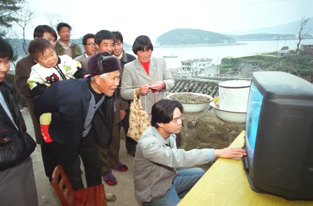 隨着手指的按動,不同的彩色畫面在電視機屏幕上切換,隨之而來的是截然不同的聲音——一會兒是字正腔圓的新聞播報,一會兒是帶着背景音樂的天氣預報,一會兒是逗人發笑的喜劇小品……電視機跟前,背着孫兒的爺爺眼睛花了,他不禁上前一步,伸長了脖子盯着電視機,背上的孩童雖看不大懂電視節目,卻也好奇地歪着腦袋打量眼前的黑色大盒子;阿姨還沒來得及放下手中織到一半的毛衣,便急急地趕來湊熱鬧……鄰居家的露台一下子成了熱鬧的會客廳。「有了電視網,就是不一樣啊!」上大陳島的漁民們聚到島上第一個安裝有線電視網的人家中,圍在正在調試的電視機前嘖嘖稱奇,大家都想第一時間一睹為快。一旁的王小川從中聽到農村起步奔跑的腳步聲,趕緊記錄下這充滿時代畫面感的情景。