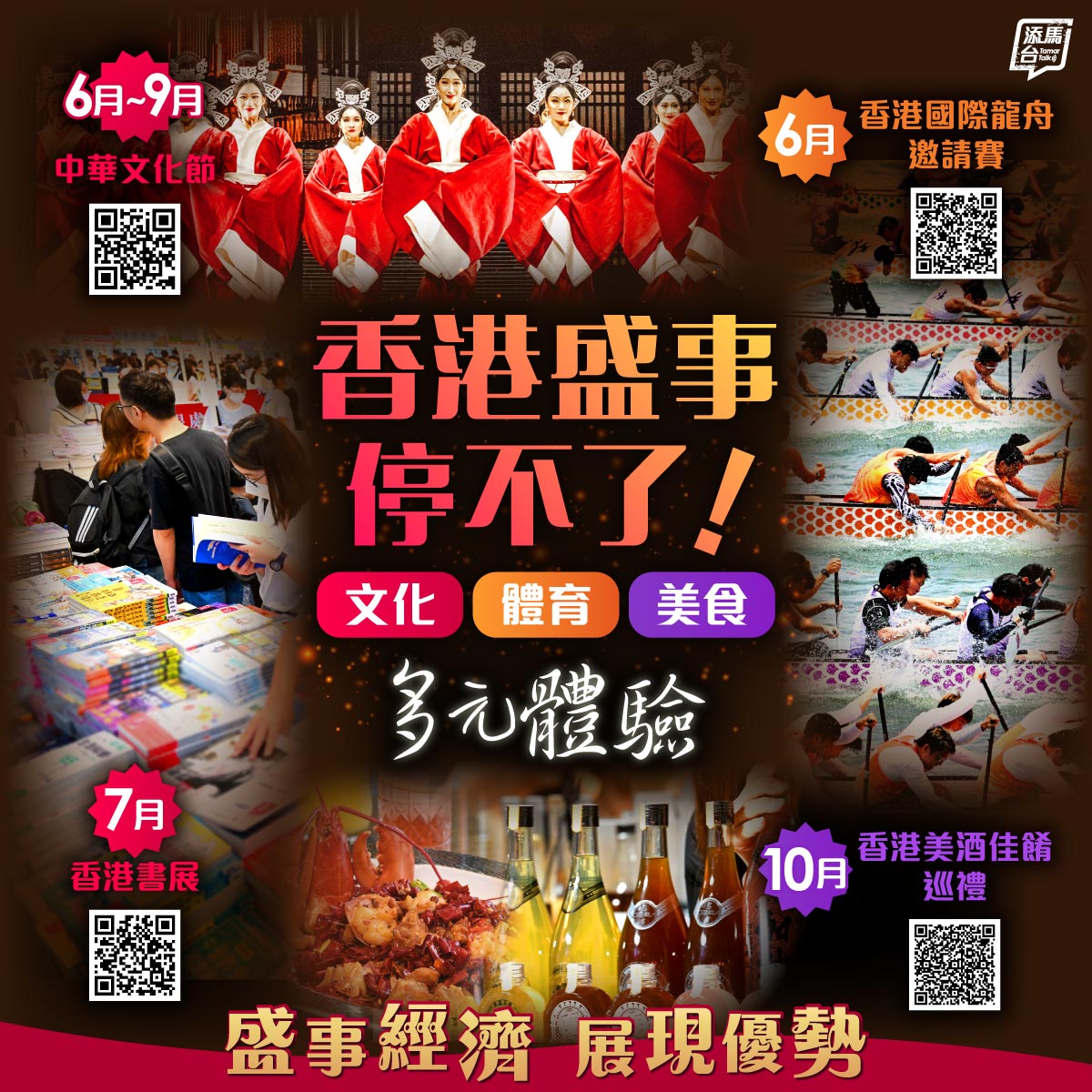 大公文匯全媒體報道,文化體育及旅遊局局長楊潤雄早前預告即將公布下半年的盛事項目名單,「添馬台」今晚(14日)就在社交平台表示,今年上半年香港已有超過100項盛事,並公布未來數月即將舉辦的不同盛事及精彩活動,包括中華文化節、2024年香港國際龍舟邀請賽、香港書展及香港美酒佳餚巡禮等,讓市民和旅客親身參與,從不同角度體驗香港的非凡魅力。