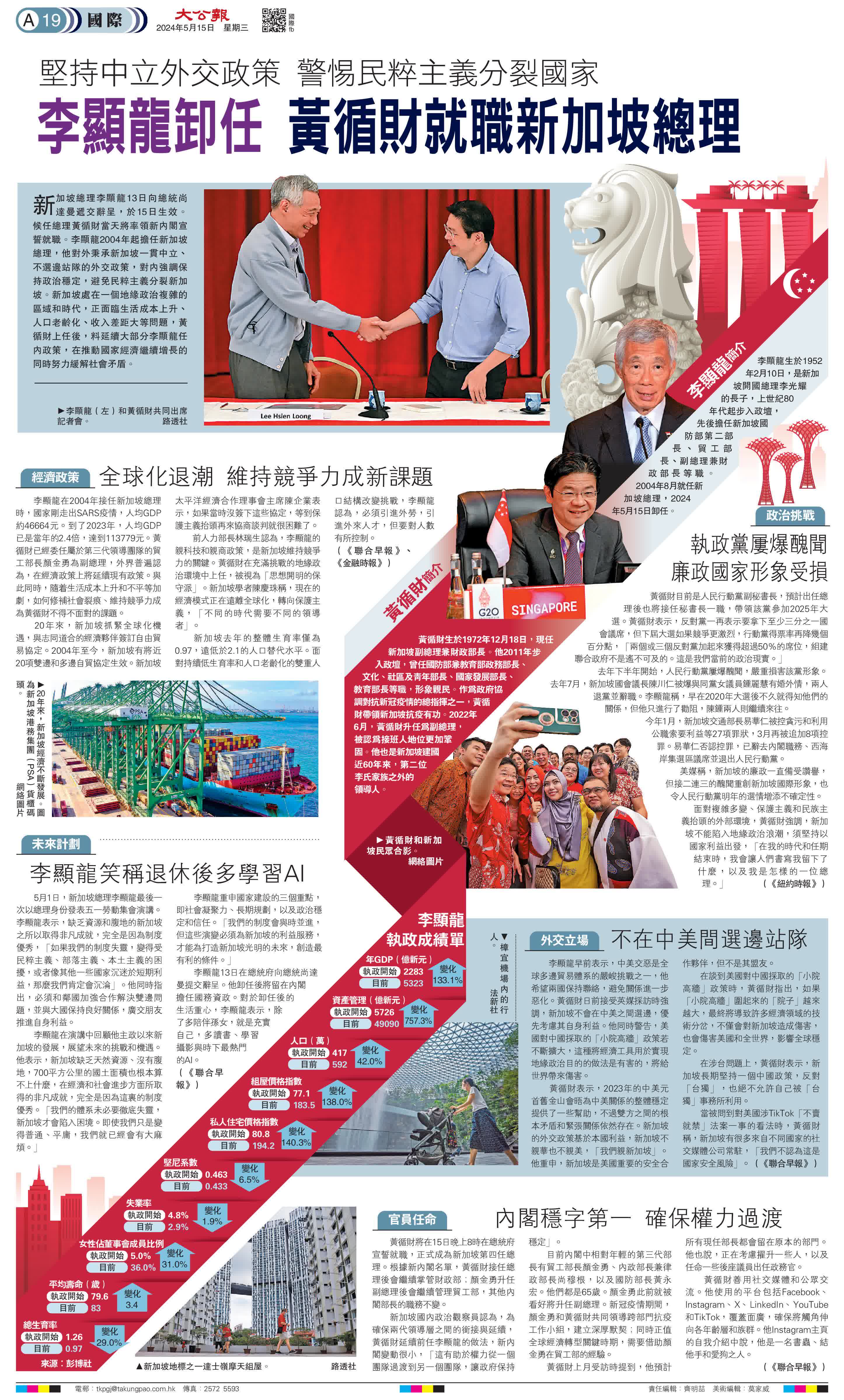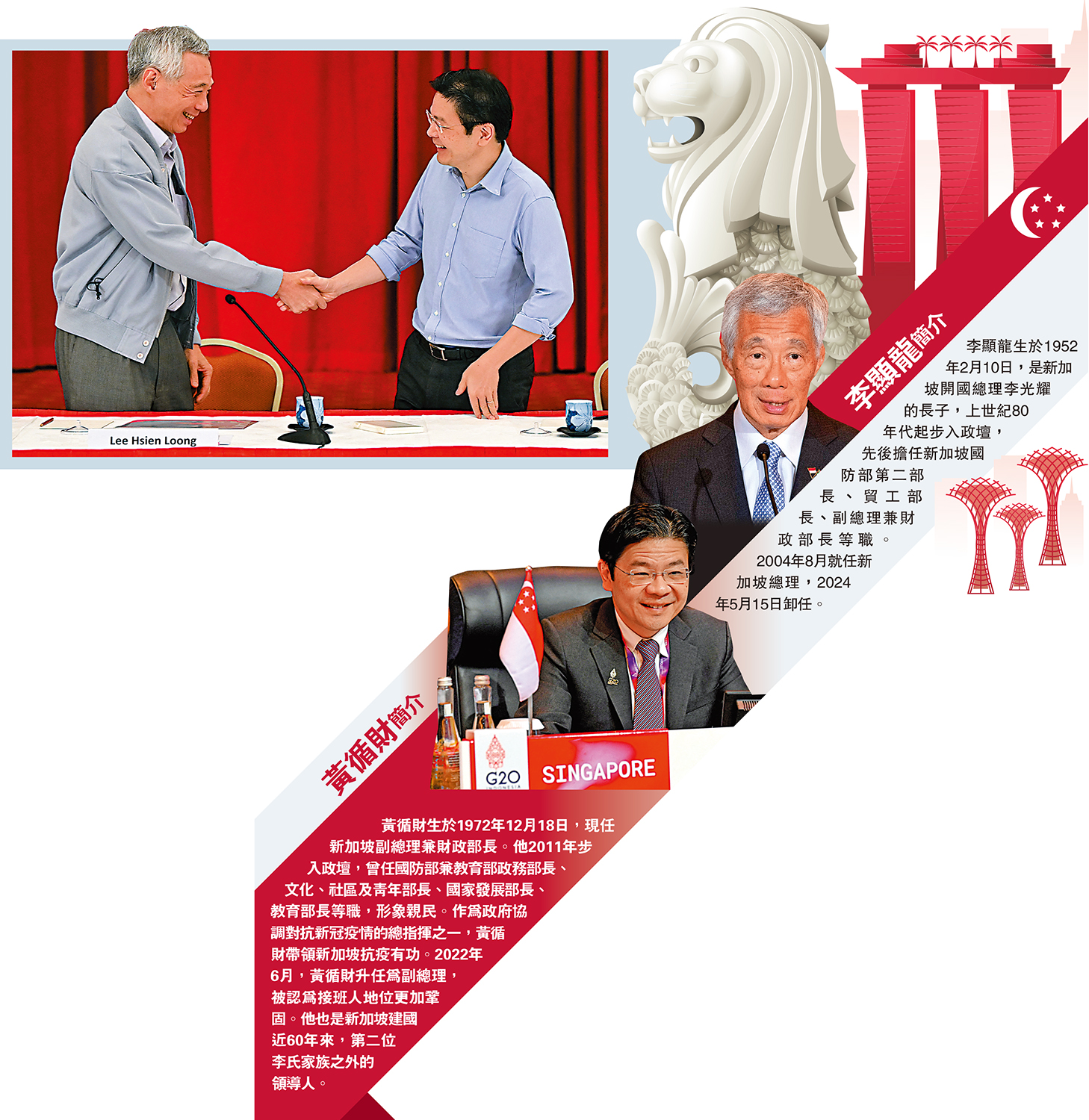 大公報綜合報道:新加坡總理李顯龍13日向總統尚達曼遞交辭呈,於15日生效。候任總理黃循財當天將率領新內閣宣誓就職。李顯龍2004年起擔任新加坡總理,他對外秉承新加坡一貫中立、不選邊站隊的外交政策,對內強調保持政治穩定,避免民粹主義分裂新加坡。新加坡處在一個地緣政治複雜的區域和時代,正面臨生活成本上升、人口老齡化、收入差距大等問題,黃循財上任後,料延續大部分李顯龍任內政策,在推動國家經濟繼續增長的同時努力緩解社會矛盾。