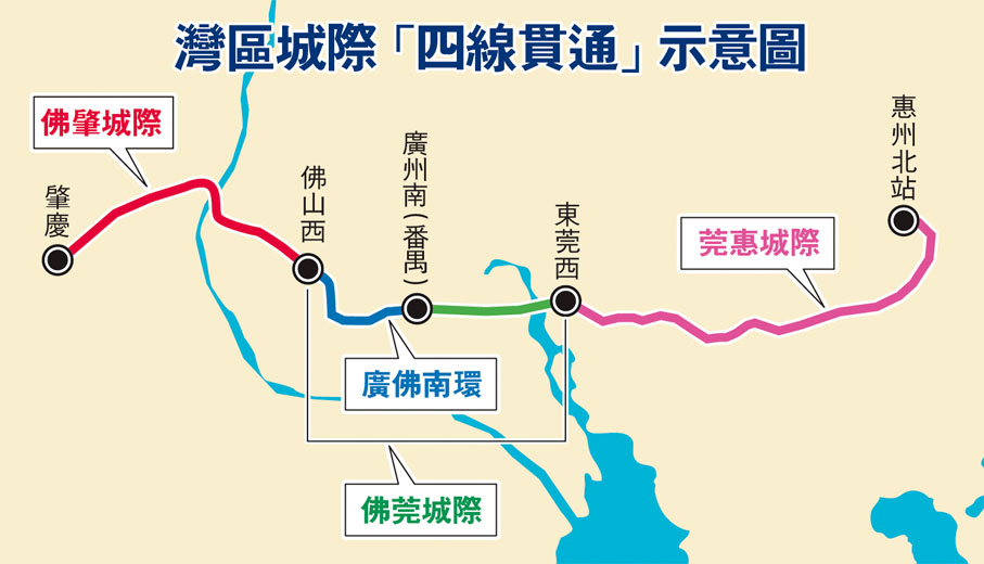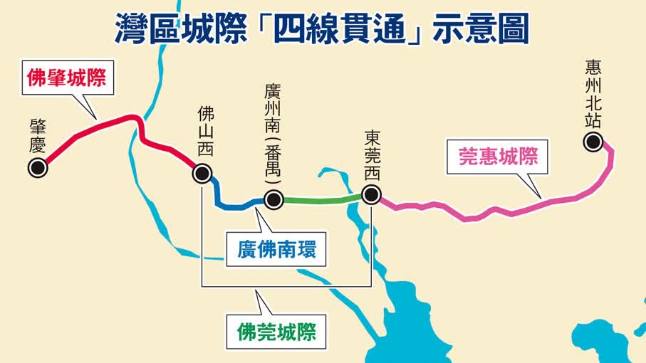 在廣佛南環、佛莞城際運行試驗期間,廣東城際運營公司初步測算四線貫通運營後,從廣州長隆站乘坐「大站快車」出發,到佛山西站、東莞的西平西站用時約30分鐘,到肇慶鼎湖東站、惠州陳江南站用時約60分鐘,將充分發揮廣州核心城市的輻射帶動作用,實現廣州至佛山、東莞中心30分鐘互達,其他城市60分鐘互達,助建「軌道上的大灣區」。