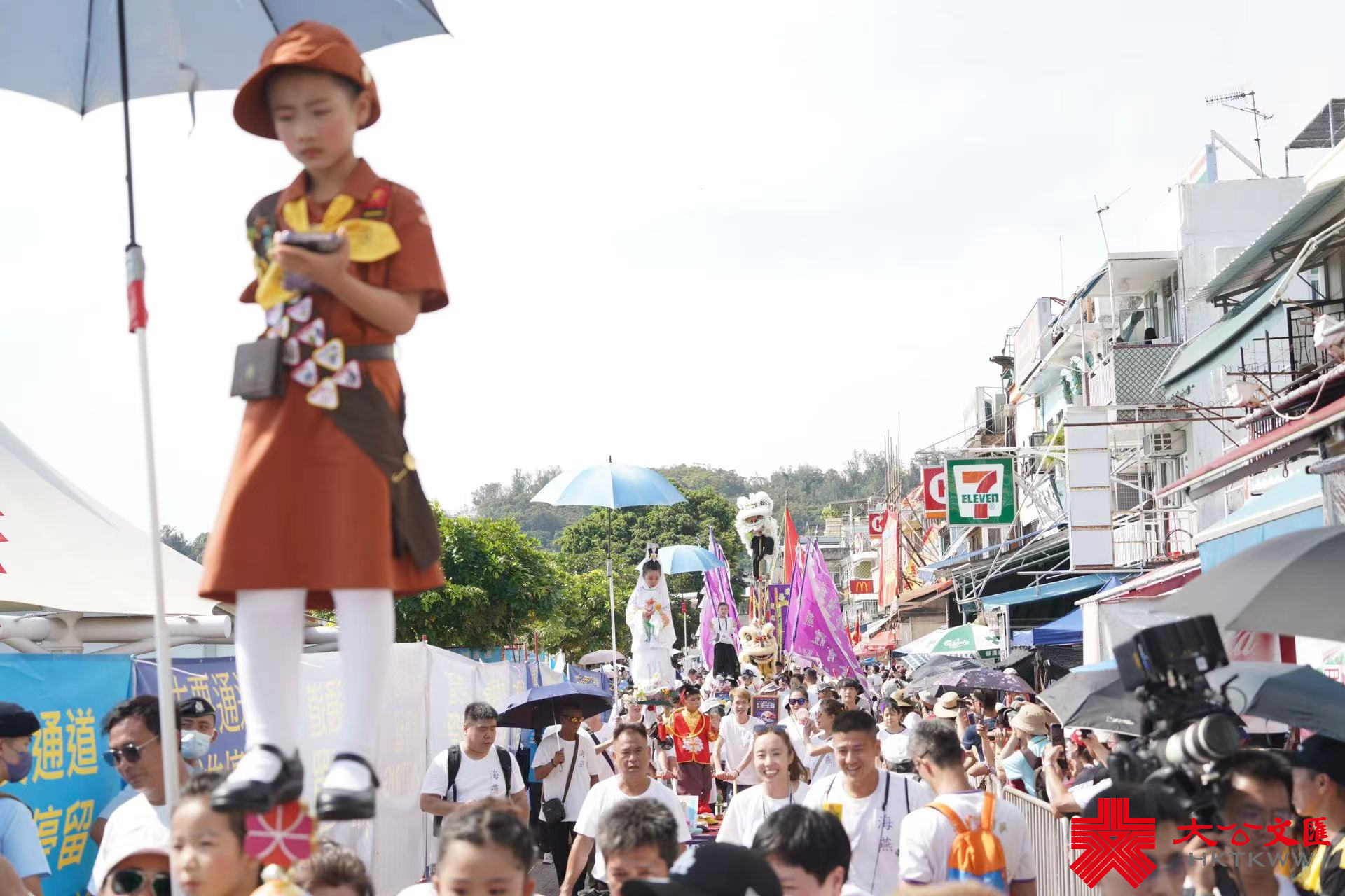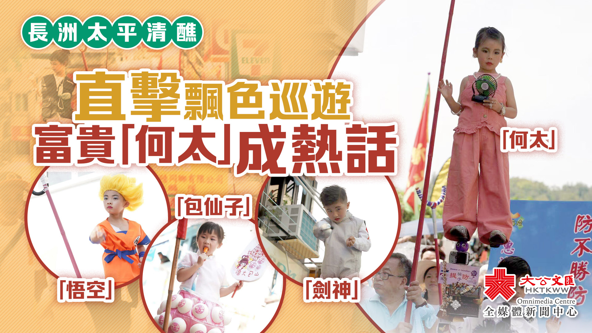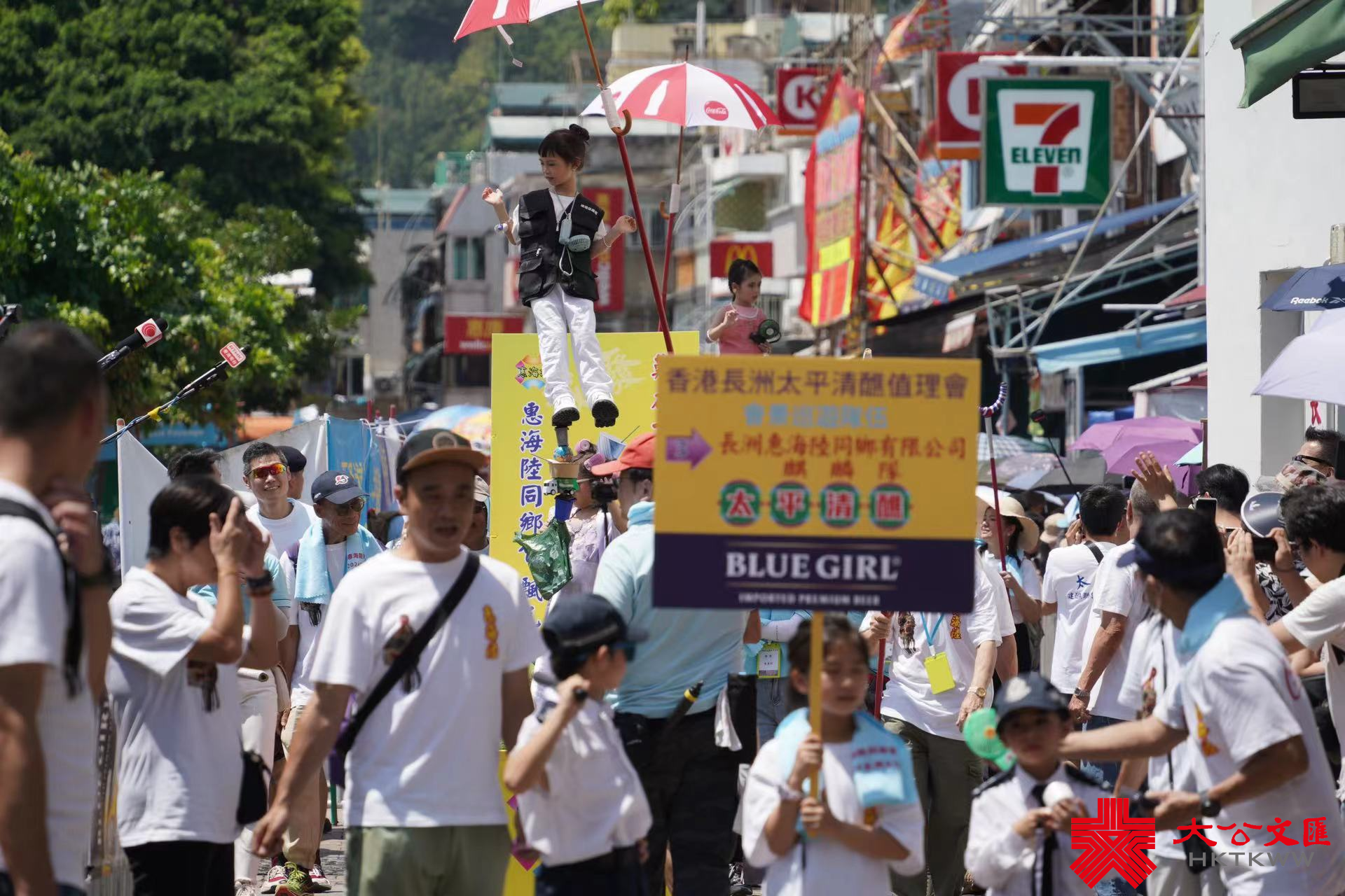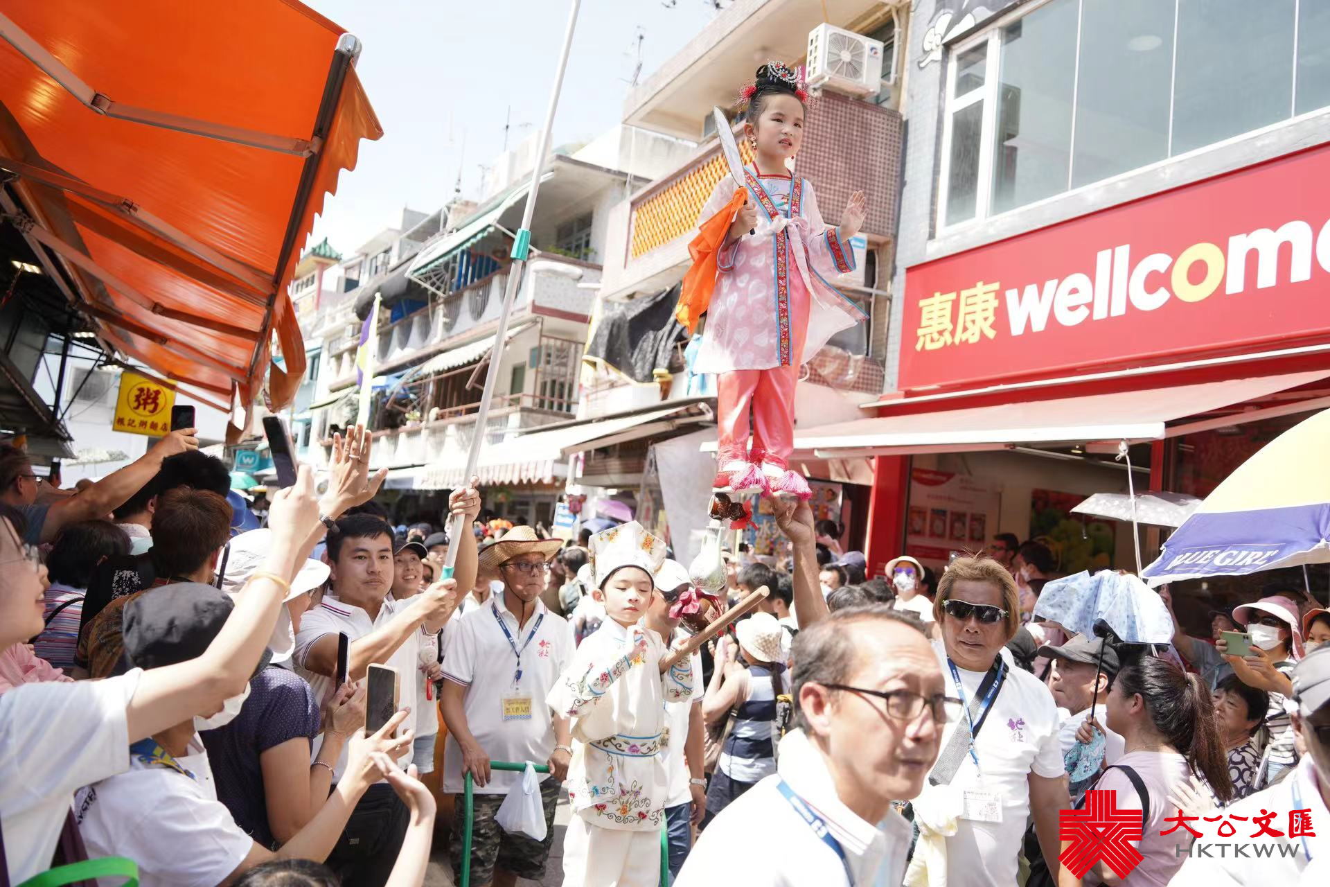 大公文匯全媒體報道,長洲年度盛事太平清醮今日(15日)舉行,其中的重頭戲之一飄色巡遊提早於下午1時半隆重上演。巡遊隊伍由麒麟領頭,從北帝廟遊樂場出發,一眾被稱為「色芯」小演員裝扮成各樣角色粉墨登場,神氣活現,沿途吸引大批市民「朝聖」。