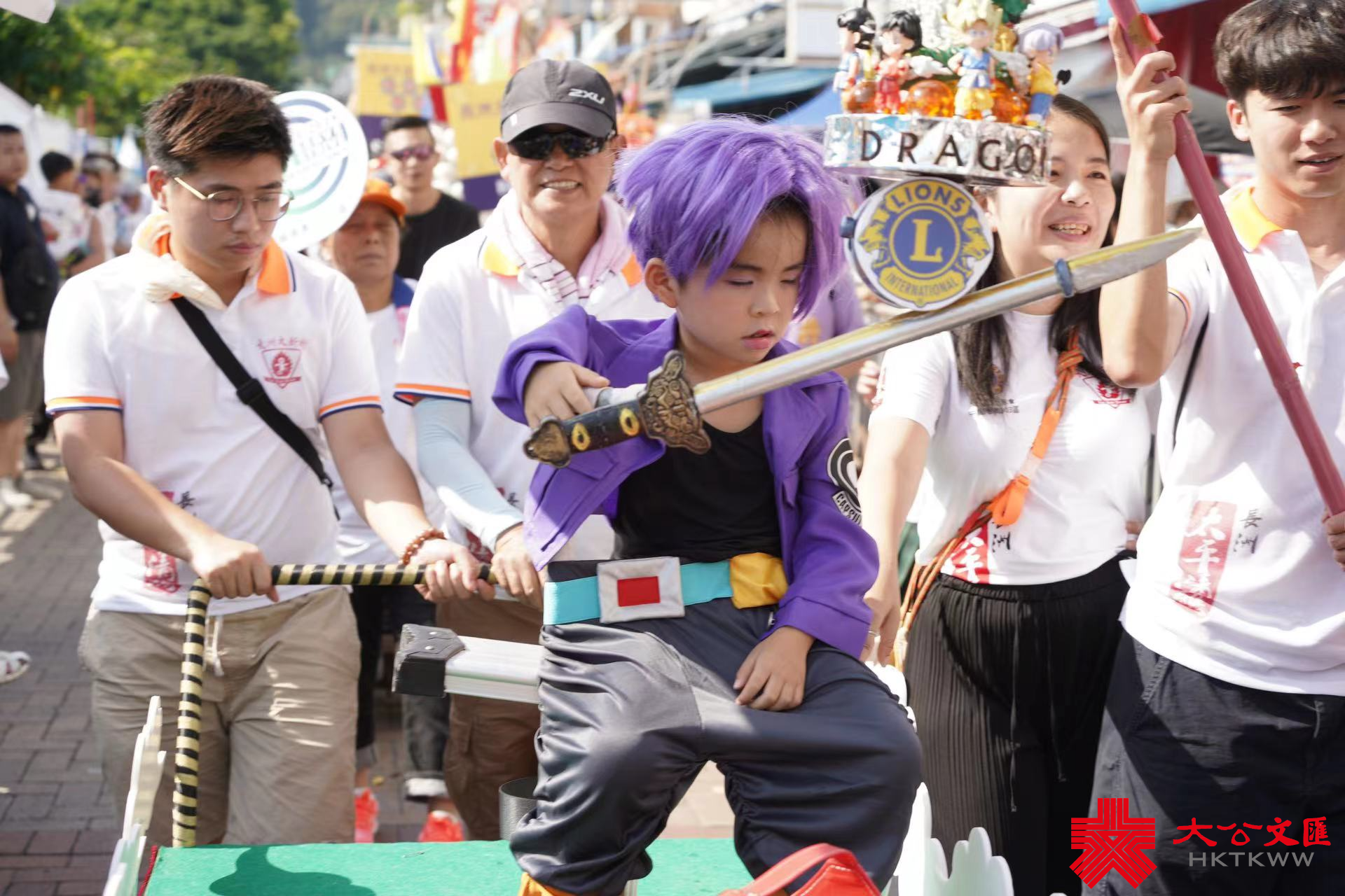 今次巡遊由惠海陸同鄉會打頭陣,主題為社會熱議的「走塑」話題,有小朋友扮演環保署人員,又掛上綠色指定袋相信意指「垃圾徵費」政策。最受矚目的要數近來全城茶餘飯後的談資「河伯娶妻」,只見有「色芯」身着粉衫,全身珠光寶氣,疑似影射「何太」,另一小「色芯」則扮演警察呼籲提防騙子。最受小朋友喜歡的則是《龍珠》中的人物「悟空」及「杜拉格斯」,相信是為紀念最近逝世的日本漫畫家鳥山明。