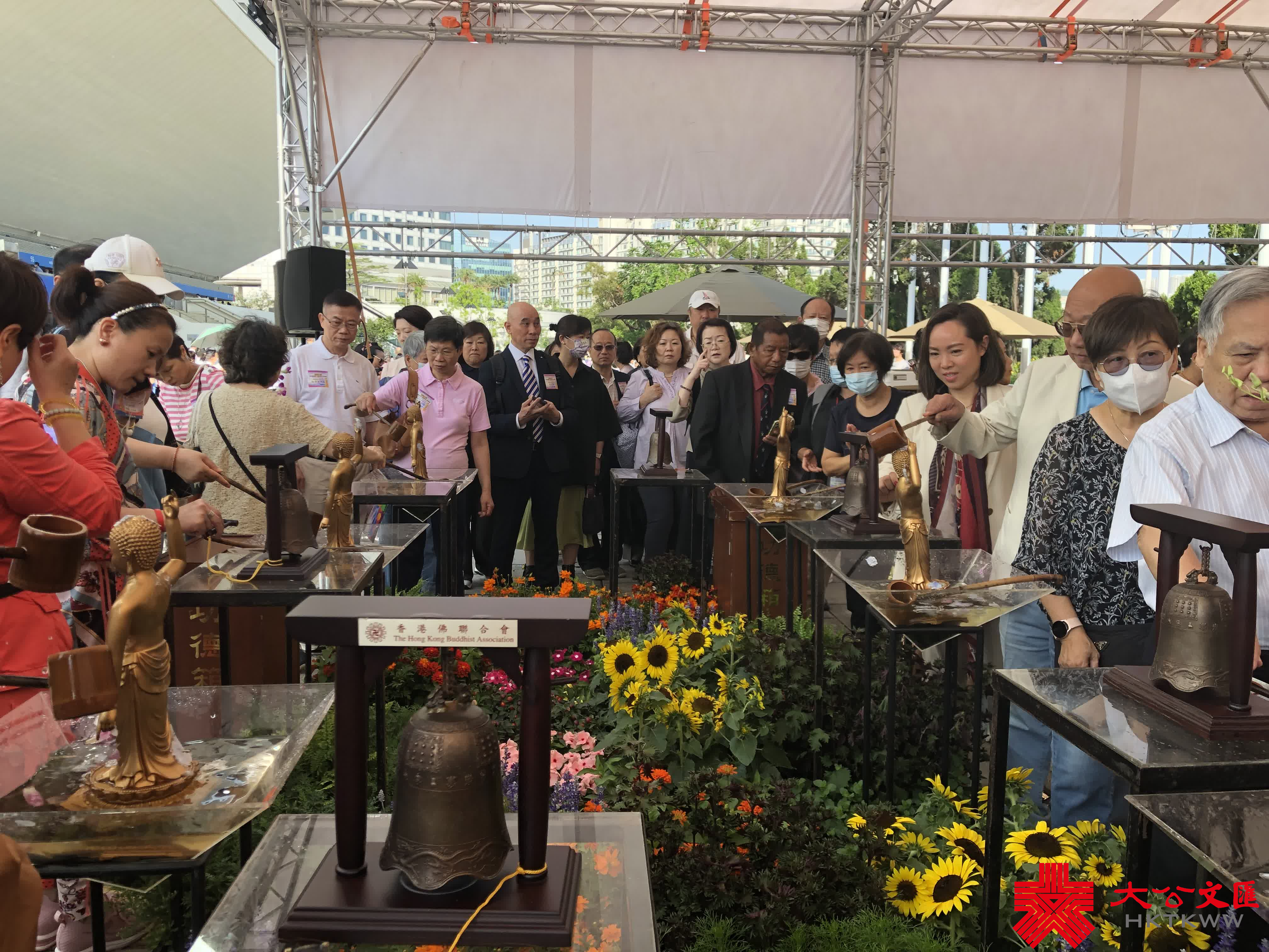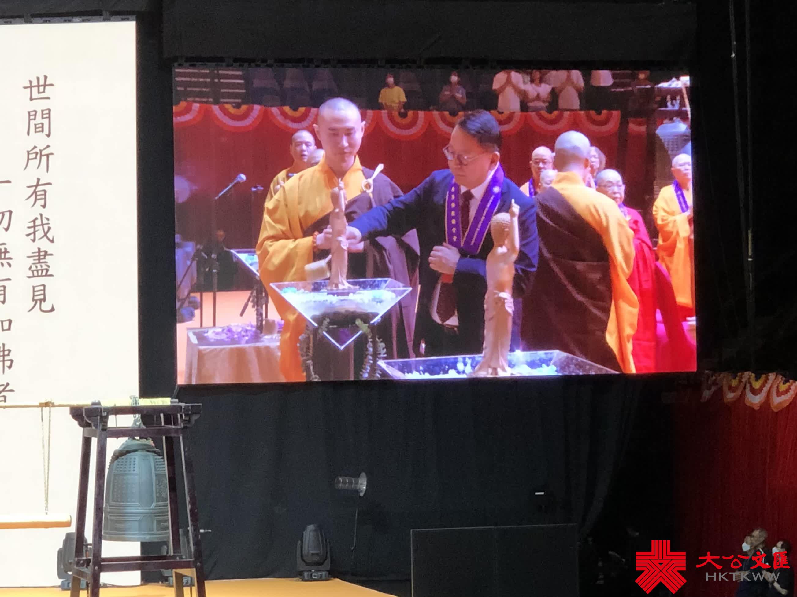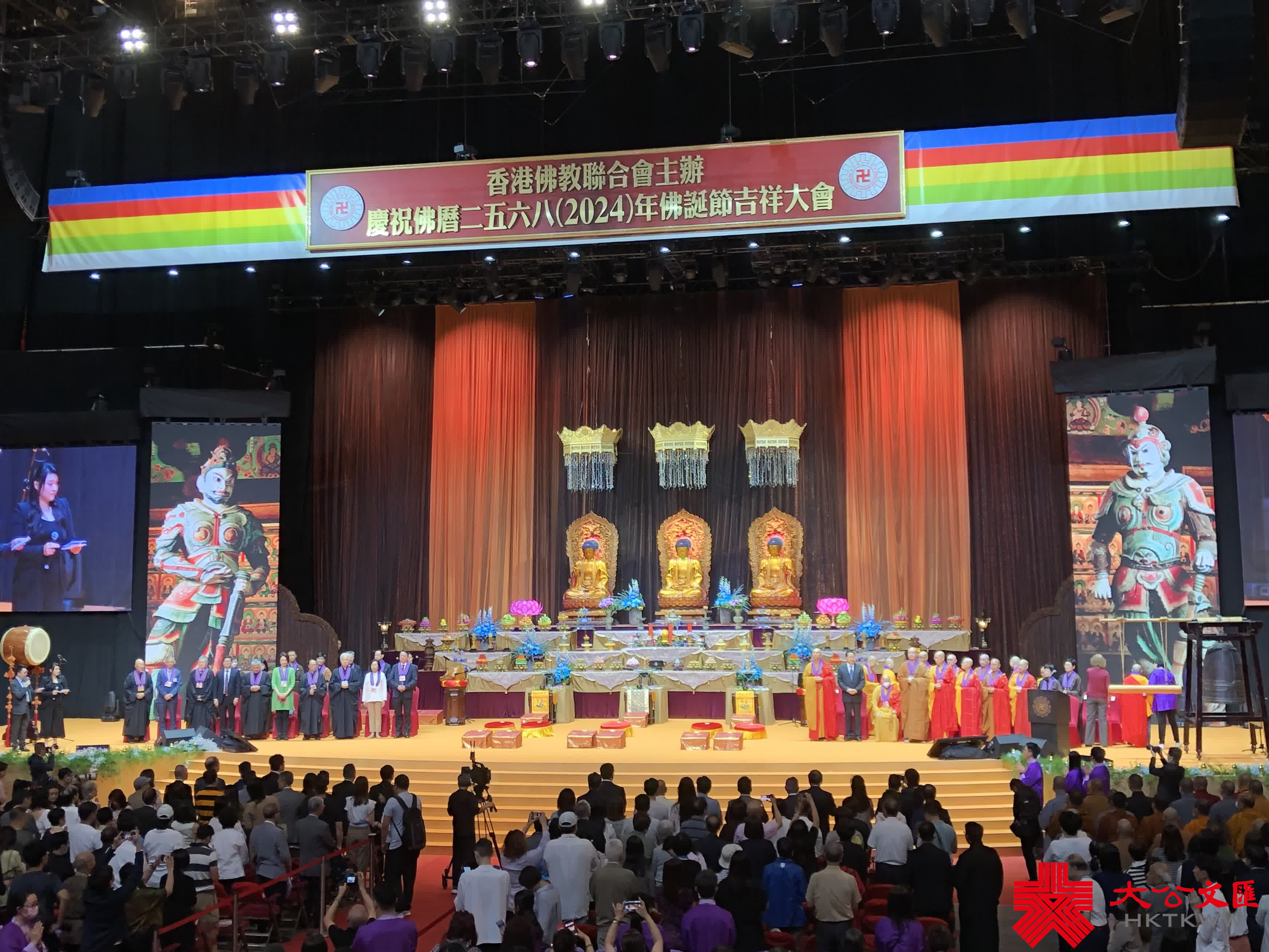 (大公文匯全媒體 記者 鄭洢林)今日(15日)為農曆四月初八,即佛誕,是慶祝佛教創始人釋迦牟尼佛誕生的日子。香港佛教聯合會為慶祝這一日子,於下午3時在紅磡香港體育館舉行「浴佛大典暨『祝福祖國•祝福香港』吉祥法會」。政務司司長陳國基、民政及青年事務局局長麥美娟等出席主禮,共同敲響場內的吉祥鐘三響,祝願佛光普照、天下太平、祖國富強、香港繁榮穩定。