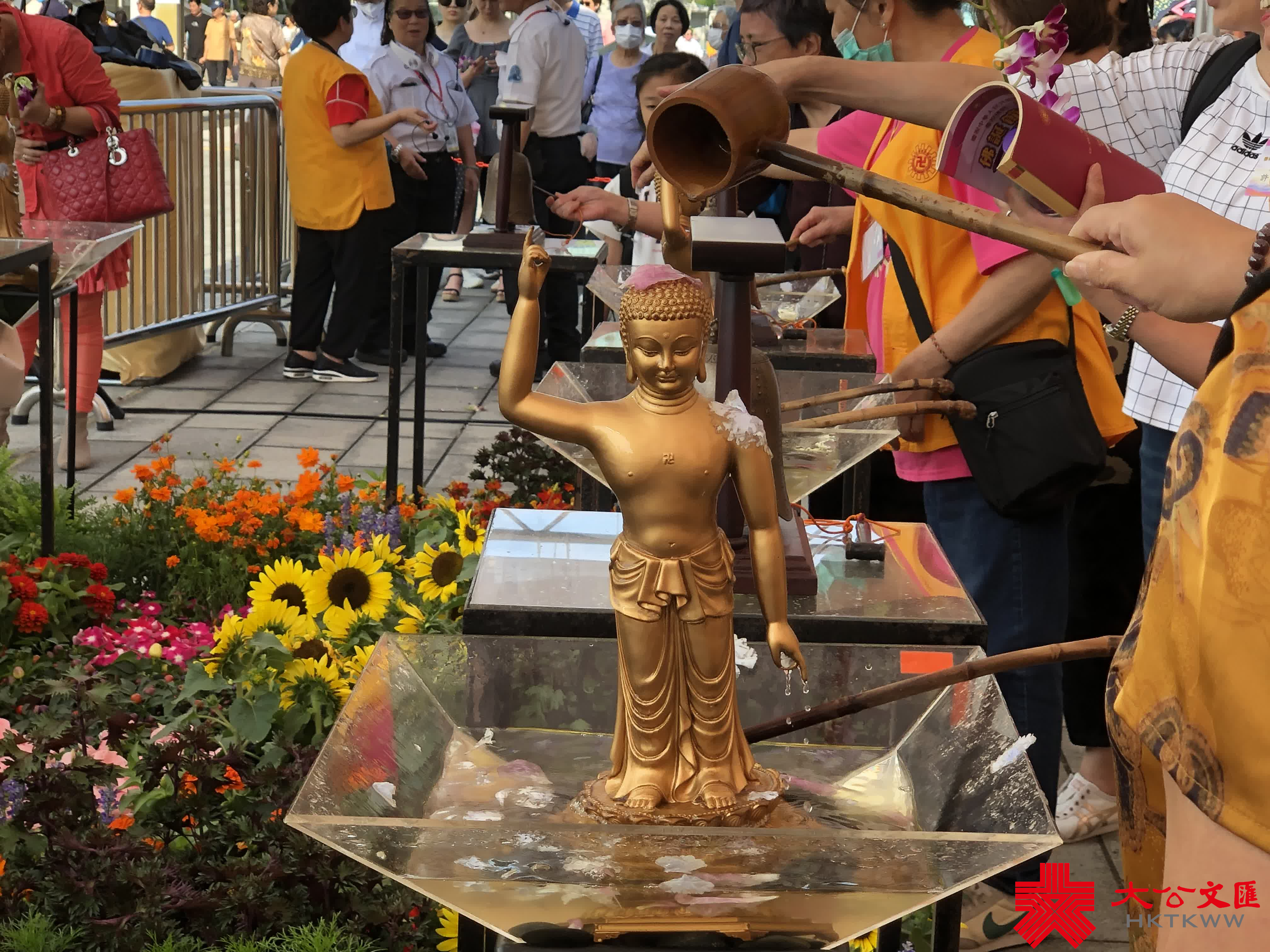在浴佛大典上,兩位法師將經文結合梵唄唱誦,眾人由香港佛教聯合會會長寬運法師帶領,在沉寂清淨的氛圍中,對三寶進行叩拜,取三瓢水淋在太子像身上,祈求平安順利。