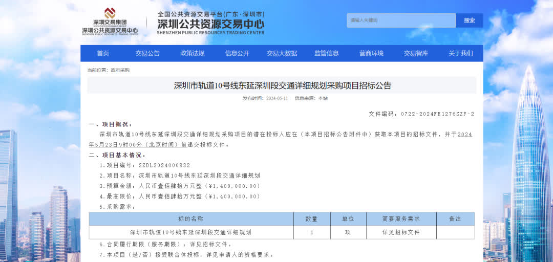 招標文件顯示,軌道10號線是深圳市中部發展軸上已運營的重要軌道幹線,起於福田中心區的福田口岸站,終至平湖雙擁街站。