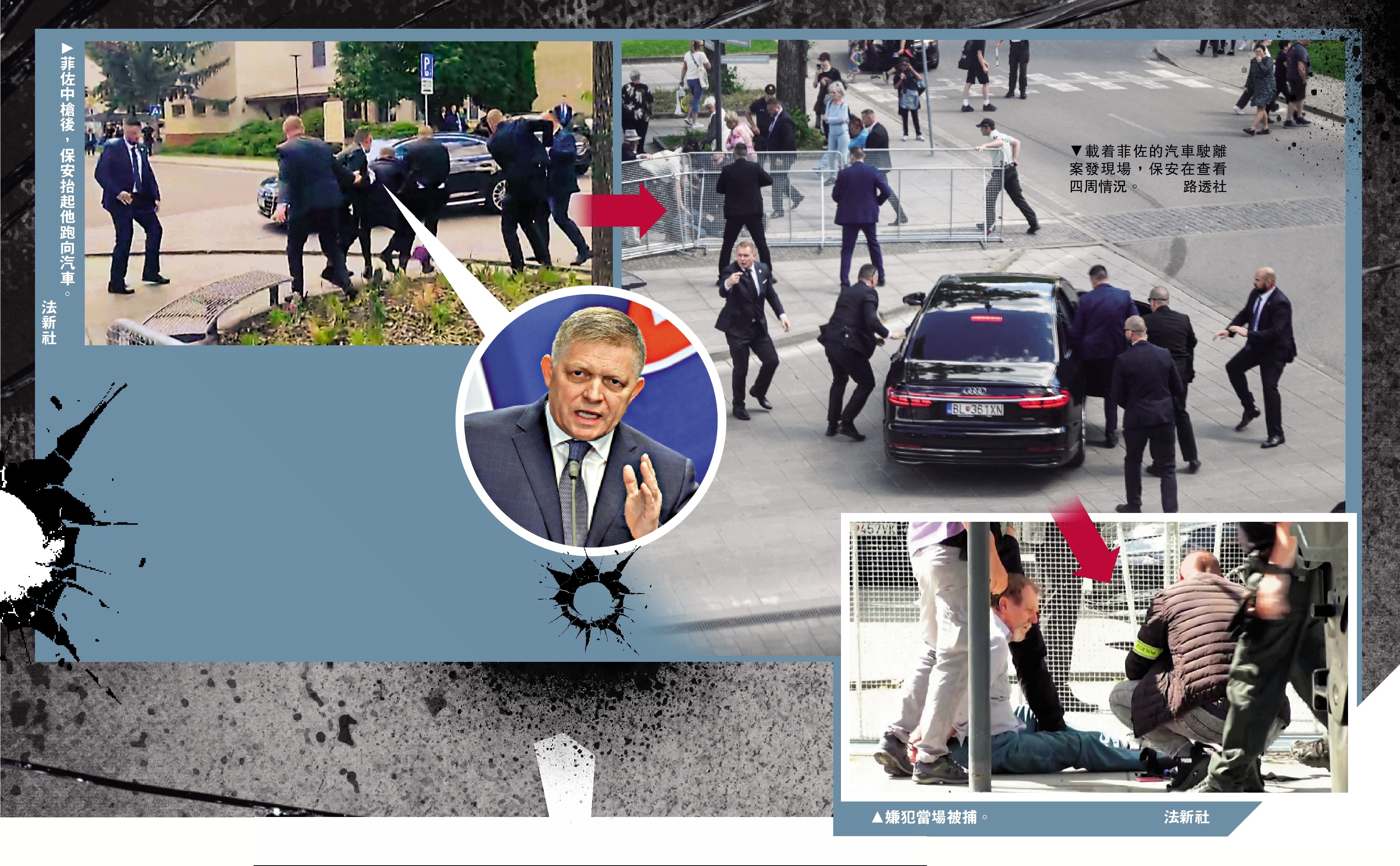 大公報報道,斯洛伐克總理菲佐15日在斯洛伐克特倫欽地區遇刺,身中5槍,被緊急送院。他接受了5個多小時的手術,目前狀況穩定,但傷勢嚴重。斯洛伐克政府稱,初步信息顯示,刺殺行動「出於政治動機」,嫌犯對政府及其改革措施不滿。此次槍擊是歐洲國家領導人20多年來首次遭遇重大刺殺未遂事件,多國發聲譴責。分析認為,受俄烏衝突、生活成本危機等因素影響,整個歐洲政治極化嚴重,社會撕裂加劇,暴力活動蔓延,針對政客的襲擊事件亦不斷增多。