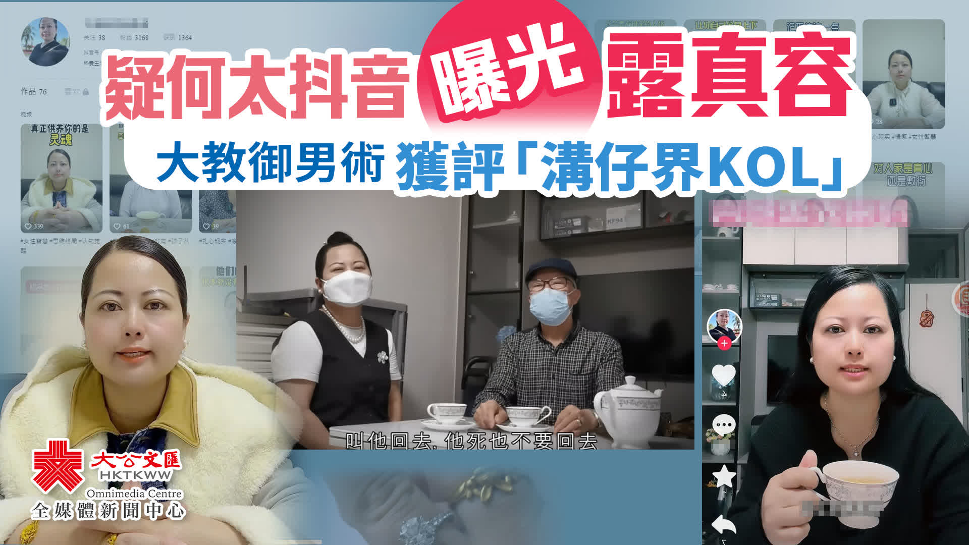 大公文匯全媒體報道,76歲何伯與比自己小30多歲的何太閃婚事件引全城熱議,《東張西望》近日播出故事最終章,惟網上輿論熱度未減。近日疑似何太真身被曝光,發現其曾在抖音上教女性在愛情關係中如何拿捏男人,更被評為「溝仔界KOL」。