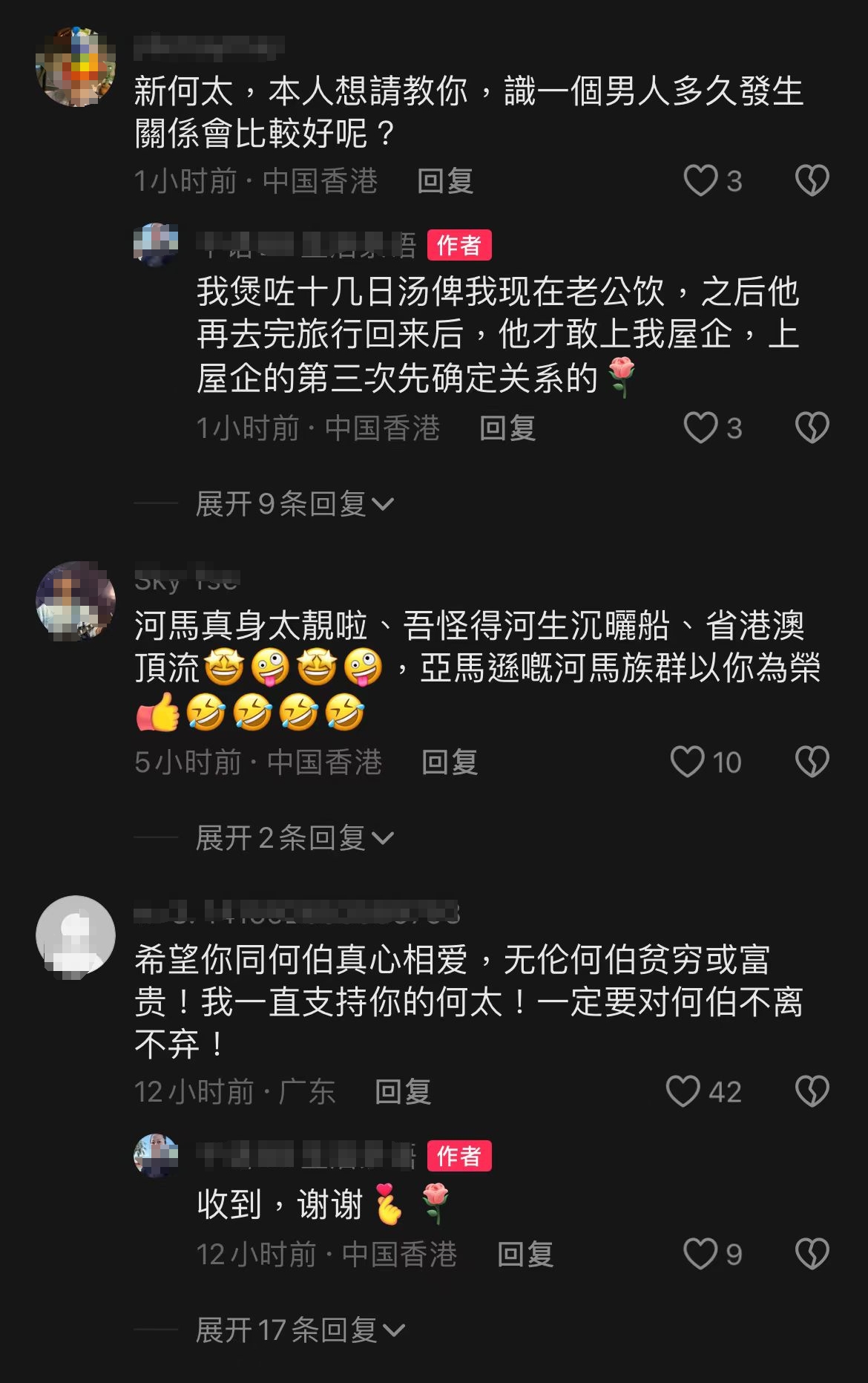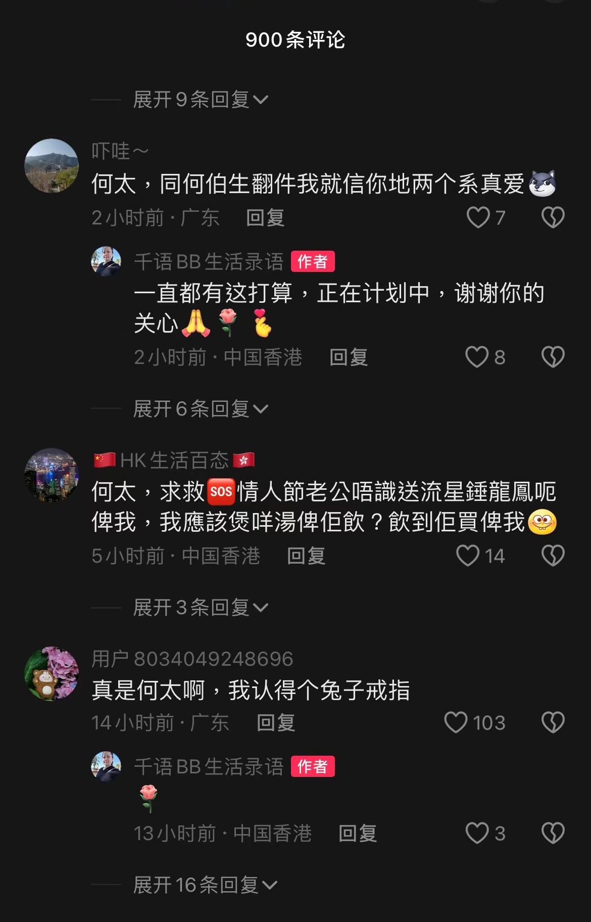 另外,影片留言中有網民直問「咁你仲會唔會養阿伯」,何太則親自回覆「會,他是好人」。除此之外,有網民在何太最新一條抖音影片留言「前夫出現了」,而何太在抖音影片下正面回應「你想多了」,「當時前夫他打我,我同仔去庇護中心住了三個月」,同時堅稱兒子是前夫親生的,網上的帖文有虛假言論。