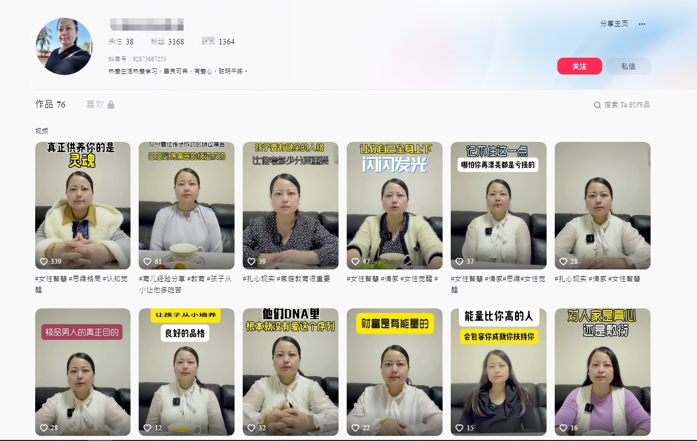 近日有網民翻出疑似何太的抖音賬號「千語BB生活錄語」,該賬戶上傳了76條影音作品,收穫大約1700位粉絲,賬號簡介上形容自己是「熱愛生活、熱愛學習,善良可親,有愛心聰明幹練。」上傳的影片主要圍繞女性提高自我價值和兩性關係,更大教廣大女性如何拿捏男人,以及分手復合的技巧,標題有如「極品男人的真正目的」「怎樣才能吸引真正愛你的人」「男人的幸福必須記住這八句話」「真正愛你的人不會讓你什麼都沒有」「輸在男人身上的女人都有這五個特徵」,吸引了不少網民留言及讚好。