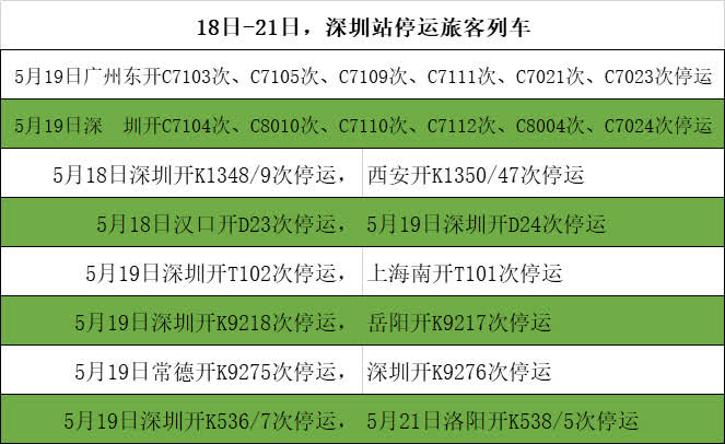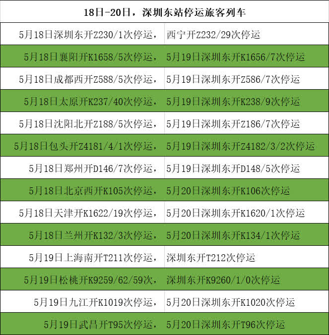 受暴雨影響,為確保列車和旅客安全,截至17日17時,5月18日—21日,深圳鐵路停運40趟普速列車、12趟廣深城際列車。