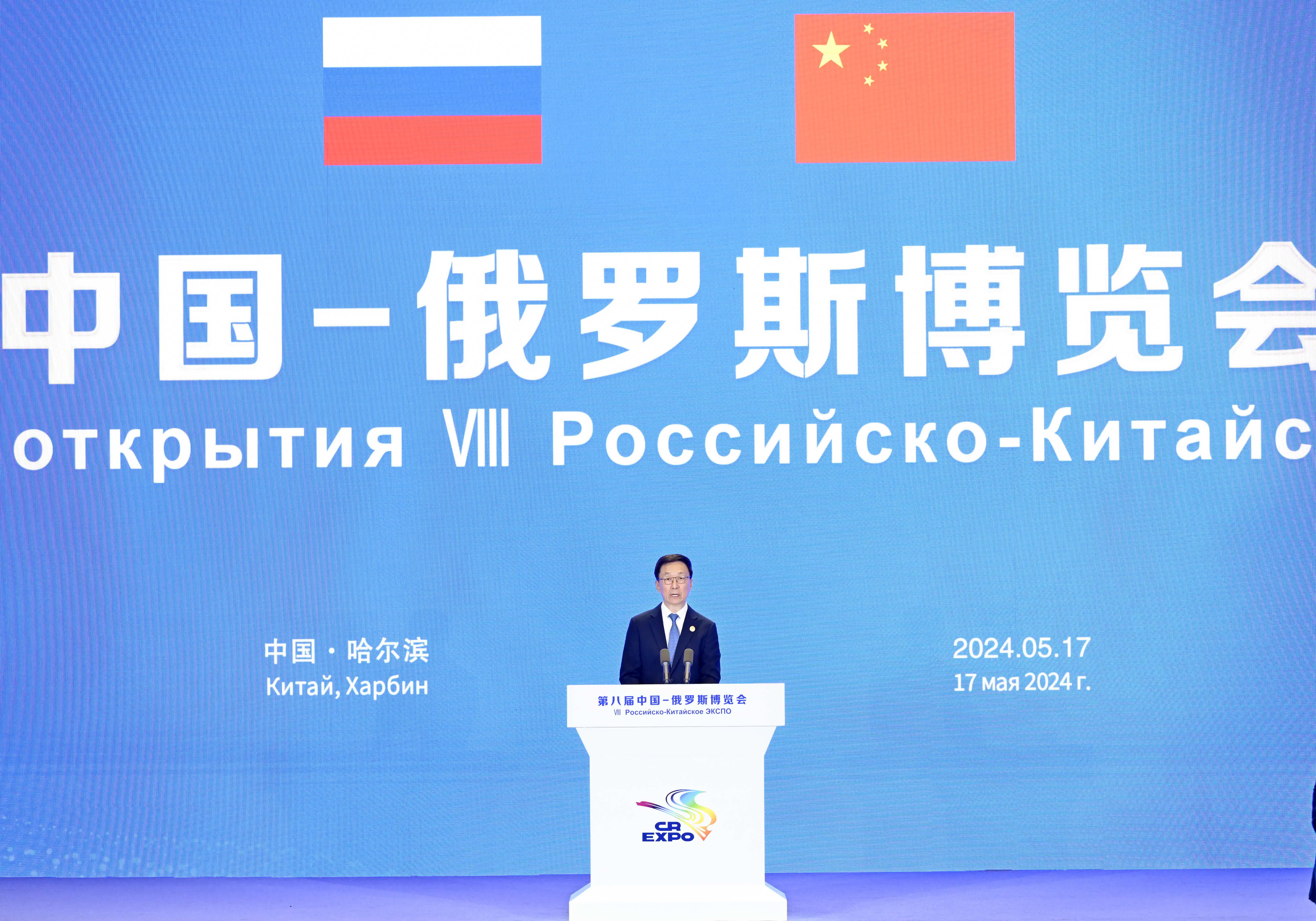 據新華社報道,5月17日,國家副主席韓正在哈爾濱同俄羅斯總統普京共同出席第八屆中俄博覽會開幕式,宣讀習近平主席賀信並致辭。