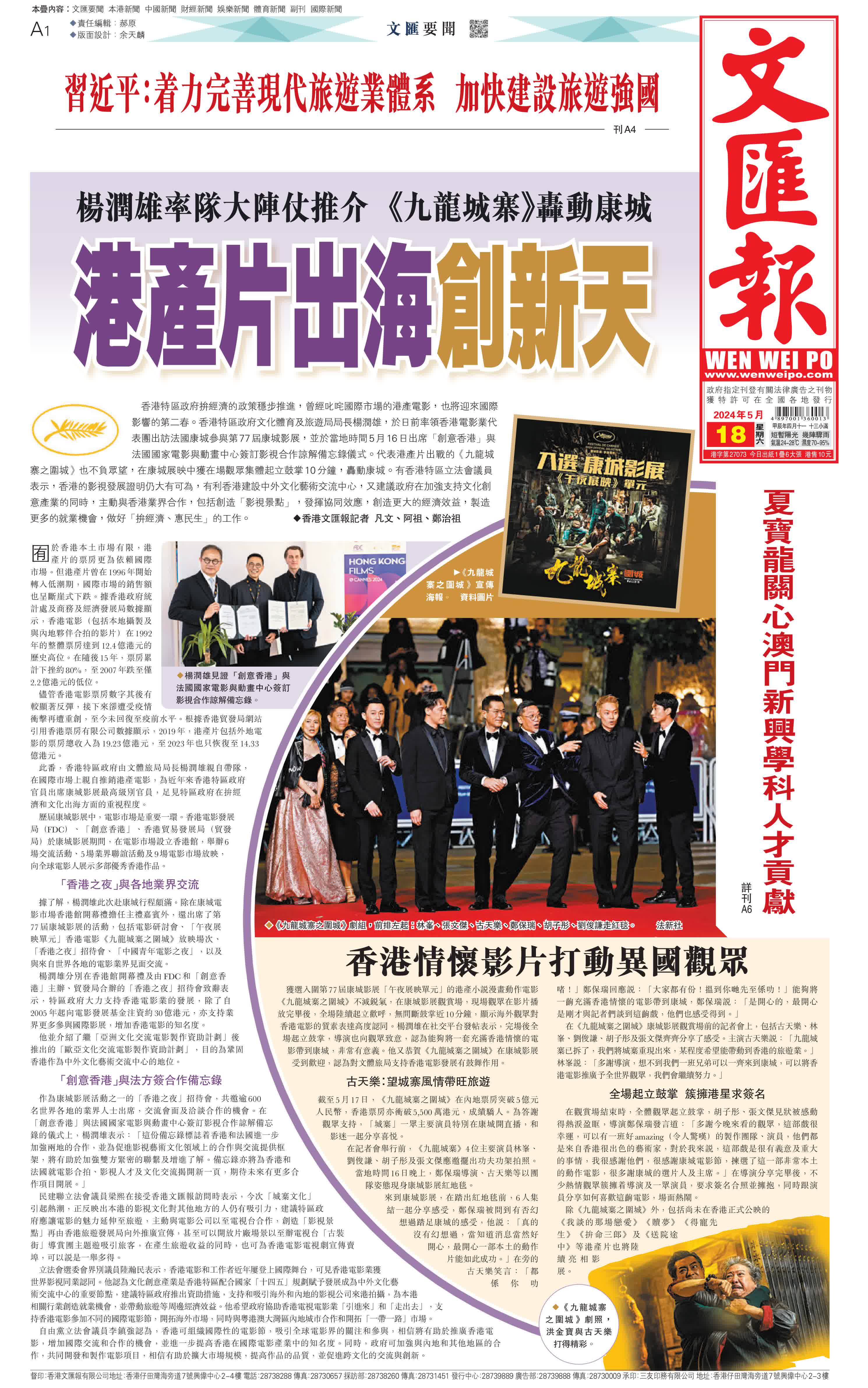(香港文匯報記者 凡文、阿祖、鄭治祖)香港特區政府拚經濟的政策穩步推進,曾經叱咤國際市場的港產電影,也將迎來國際影響的第二春。香港特區政府文化體育及旅遊局局長楊潤雄,於日前率領香港電影業代表團出訪法國康城參與第77屆康城影展,並於當地時間5月16日出席「創意香港」與法國國家電影與動畫中心簽訂影視合作諒解備忘錄儀式。代表港產片出戰的《九龍城寨之圍城》也不負眾望,在康城展映中獲在場觀眾集體起立鼓掌10分鐘,轟動康城。有香港特區立法會議員表示,香港的影視發展證明仍大有可為,有利香港建設中外文化藝術交流中心,又建議政府在加強支持文化創意產業的同時,主動與香港業界合作,包括創造「影視景點」,發揮協同效應,創造更大的經濟效益,製造更多的就業機會,做好「拚經濟、惠民生」的工作。