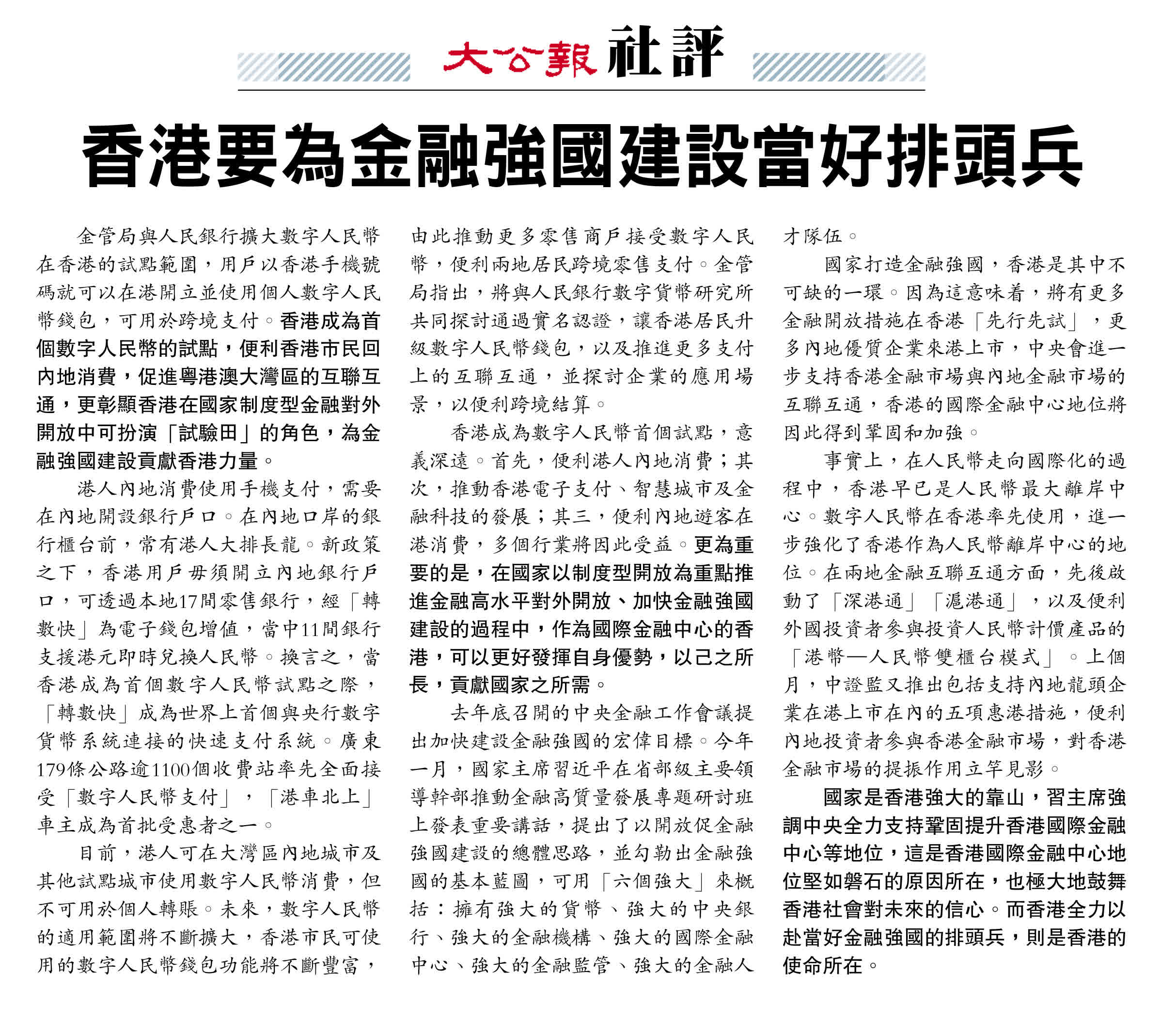 金管局與人民銀行擴大數字人民幣在香港的試點範圍,用戶以香港手機號碼就可以在港開立並使用個人數字人民幣錢包,可用於跨境支付。香港成為首個數字人民幣的試點,便利香港市民回內地消費,促進粵港澳大灣區的互聯互通,更彰顯香港在國家制度型金融對外開放中可扮演「試驗田」的角色,為金融強國建設貢獻香港力量。