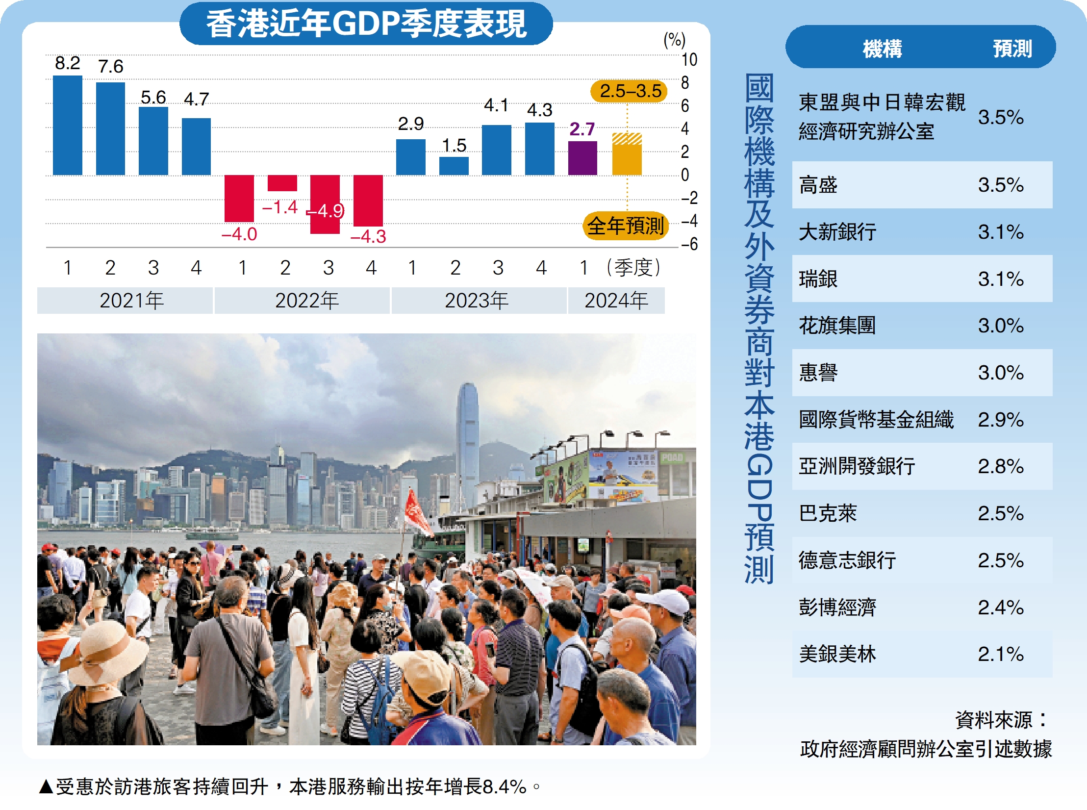 (大公報記者 賴振雄)各界正在努力「拚經濟、拚發展」,本港經濟持續復甦。特區政府公布2024年第一季經濟狀況數據,本地生產總值(GDP)按年溫和增長2.7%,跟原先估計相同,也是連續五季錄得增長,預測全年增長維持2.5%至3.5%不變。有經濟學者分析,本港第二季金融及股市暢旺,旅客量可望第三、四季持續上升,全年經濟增長有機會高於預期。