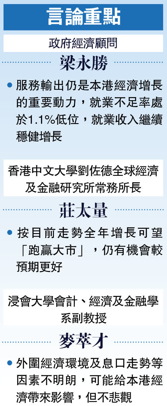 香港中文大學劉佐德全球經濟及金融研究所常務所長莊太量表示,首季經濟增長符合預期,第二季金融業暢旺,股市反彈,可望錄得更好增長,展示第三、四季仍要視乎金融股市上升勢頭能否持續,以及旅客量可否進一步上升,按目前走勢全年增長可望「跑贏大市」,仍有機會較預期更好。