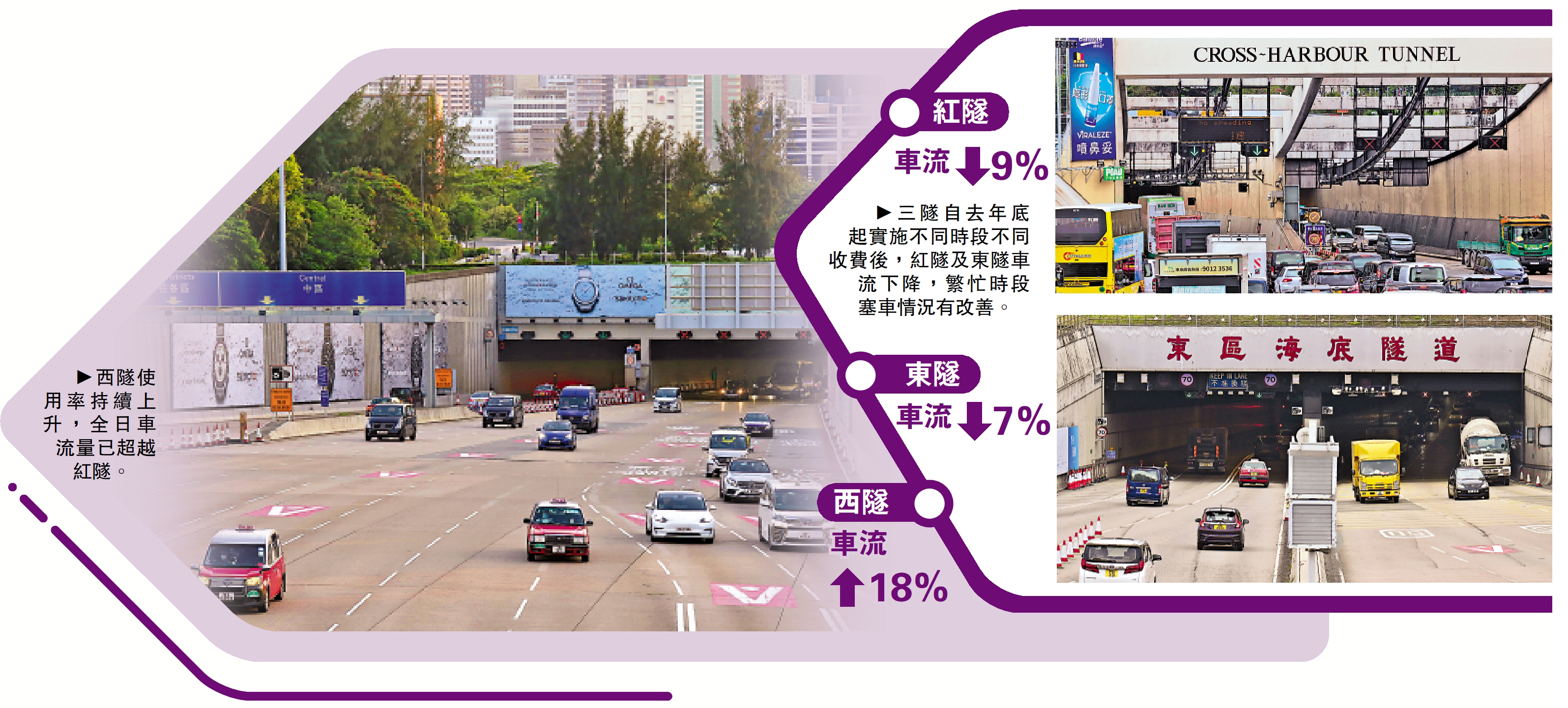 (大公報記者 賴振雄)三條過海隧道自去年12月17日起,實施不同時段不同收費,截至上月,每日過海車流約27萬架次,與實施前相若;整天車流量計算,西隧車流上升約18%,紅隧車流下降9%,東隧車流亦下降7%,西隧車流量已超越紅隧。