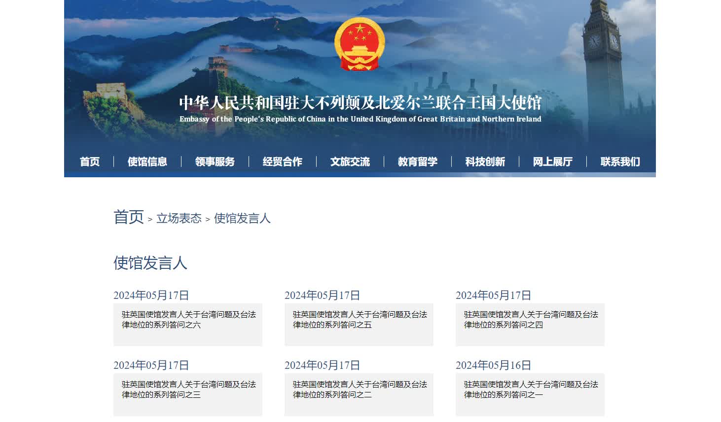 大公文匯全媒體報道,據中國駐英國使館網站公布,使館昨日(17日)連發六文,清楚闡釋台灣問題及台法律地位。