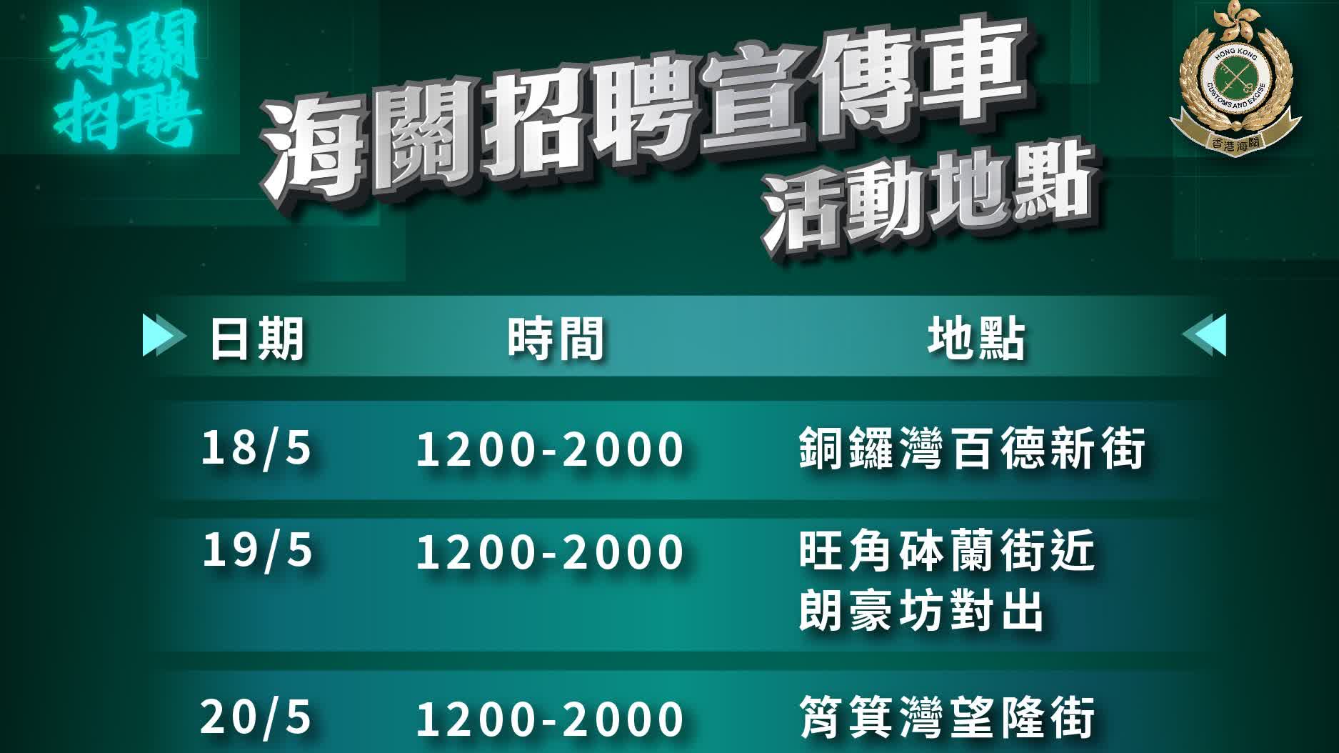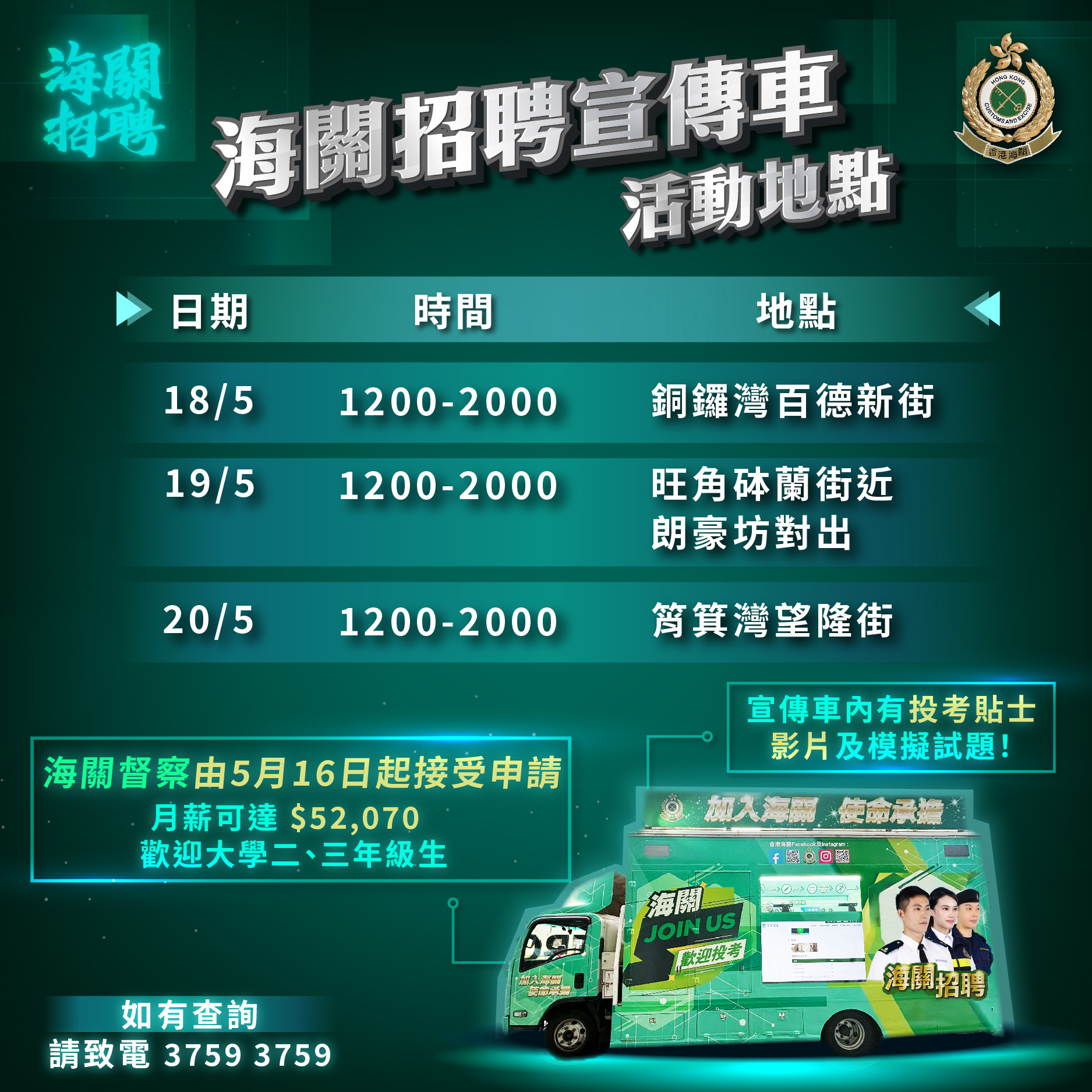 大公文匯全媒體報道,新一輪香港海關督察招募已經展開,海關招聘宣傳車也到全港各區宣傳。海關宣傳車今日(18日)到銅鑼灣百德新街,明日到旺角砵蘭街近朗豪坊對出,而周一則會到筲箕灣望隆街。