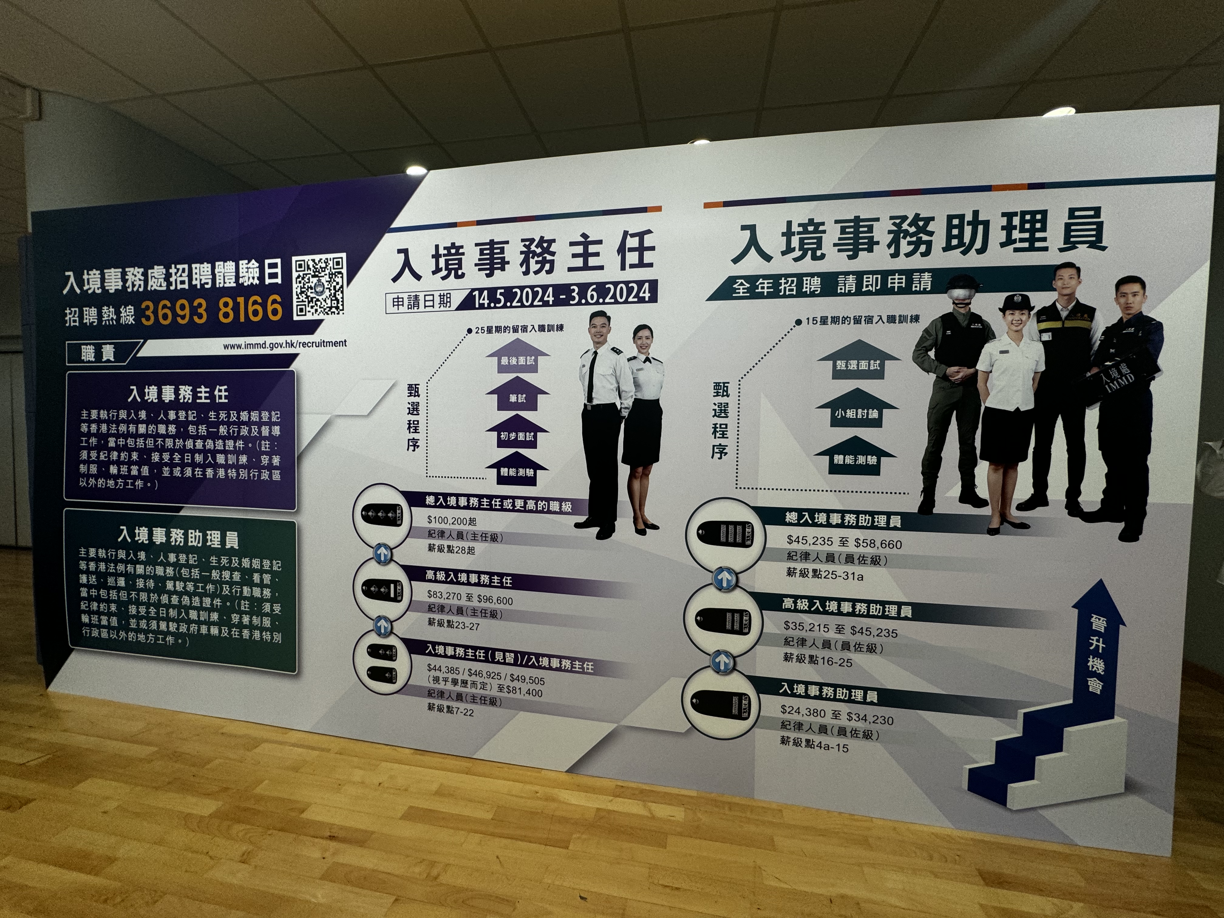 入境事務處現時招聘入境事務主任及入境事務助理員,前者薪金由44385元至81400元不等,招聘日期至6月3日截止;後者薪金由24380元至34230元不等,全年開放申請。