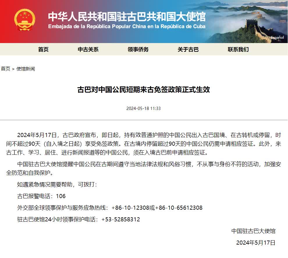 大公文匯全媒體報道,2024年5月17日,古巴政府宣布,即日起,持有效普通護照的中國公民出入古巴國境、在古轉機或停留,時間不超過90天(自入境之日起)享受免簽政策。在古境內停留超過90天的中國公民仍需申請相應簽證。此外,來古工作、學習、居住、進行新聞報道等的中國公民,須在入境古巴前申請相應簽證。