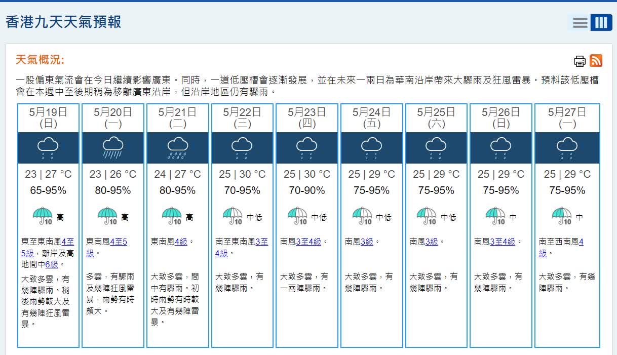 中國天氣網預報,今明天(5月19日至20日),南方部分地區強降雨持續,廣東、廣西等地局部有特大暴雨,需注意防範次生災害的發生;北方部分地區今天也將有雷雨天氣。受冷空氣和降雨影響,北方今天高溫範圍縮減,明天華北、黃淮等地的高溫將暫時緩解,但下周還將有高溫天氣出沒,公眾請注意防暑。